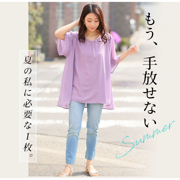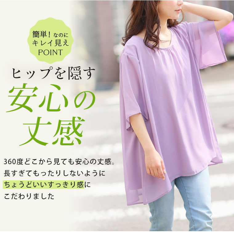 ■着用感:ちょうどいい、■着丈:お尻すっぽり、■バスト:ちょうどいい、■腕回り:ちょうどいい、■袖口:ちょうどいい、■袖丈:肘上、■首回り:ちょうどいい、■ウエスト:-、■ヒップ:-、■太もも:- ●ストンとしたシルエットで体のラインを拾わず体型カバーしてくれます。軽い着心地なのも嬉しいポイントです。