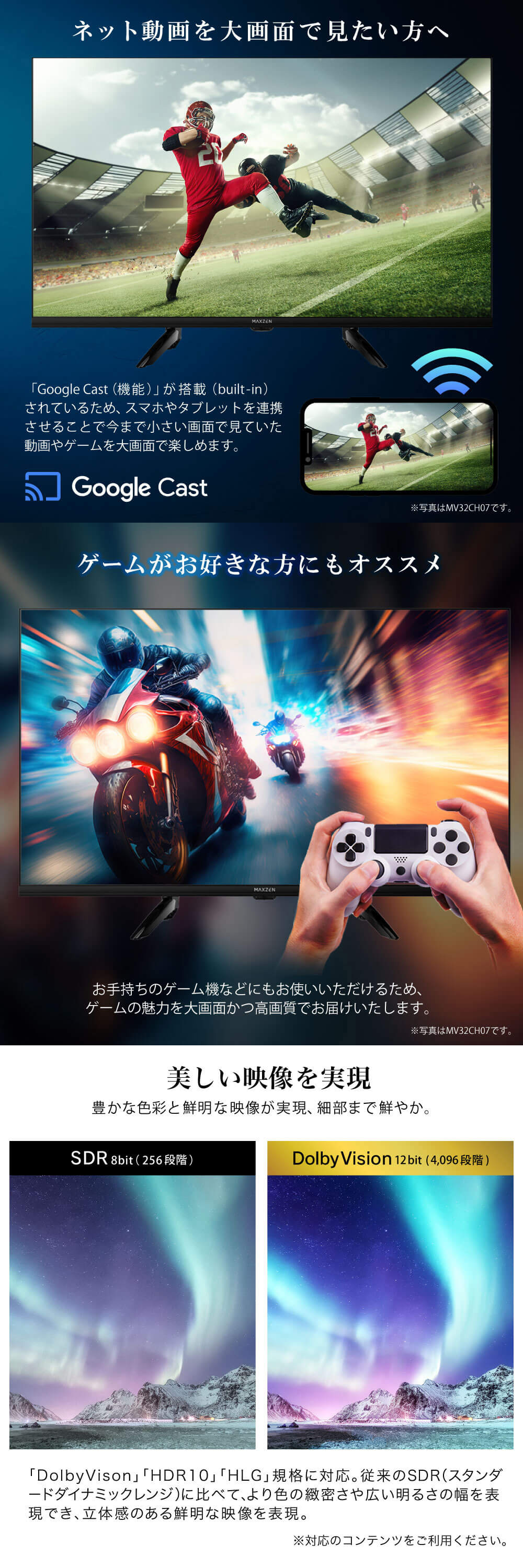 「DolbyVison」「HDR10」「HLG」規格に対応。従来のSDR(スタンダードダイナミックレンジ)に比べて、より色の緻密さや広い明るさの幅を表現でき、立体感のある鮮明な映像を表現。