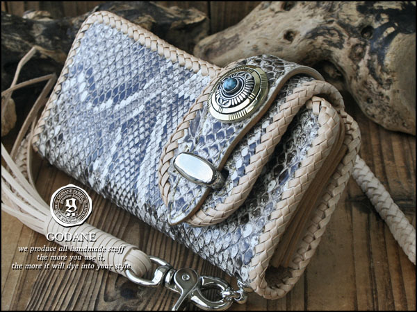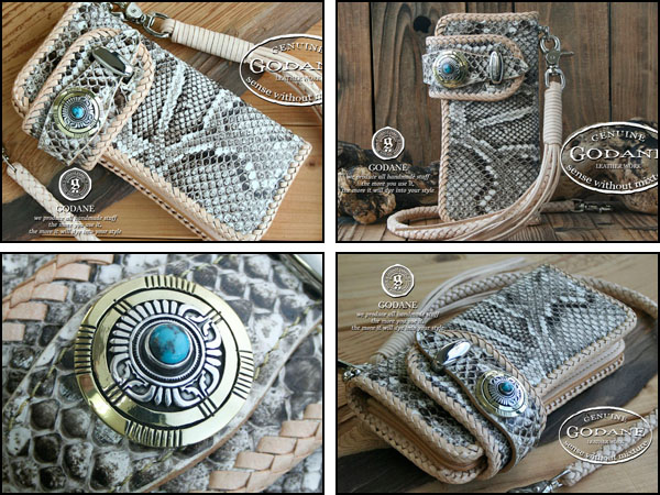 ■W(幅)20cm×H(高)10cm(ベルト部分は含まない)■重量:約360g■パイソンスキン:ナチュラルダイヤモンドパイソン■サドルレザー:ベジタブルタンニンサドルレザー■コンチョ:シルバー925+真鍮+ターコイズ■サイドフック:真鍮(合金)■コンチョボタンホック開閉式■小銭入れ×1(ファスナー式)■札入れ×1(マチ付)■ポケット×4■カード入×11■ロープフックは右バックポケットに対応※ご注意※・パイソン素材は天然皮革を使用しているので「斑(ウロコ)」の出方に個体差があります。・天然素材の為、商品により柄の出かたが異なります。画像は代表的な柄(班)を載せております。・柄でのお取替えは出来ませんので予めご了承ください。・パイソンの斑は商品により浮いてる箇所がある場合が御座います。そちらは不良では御座いません。