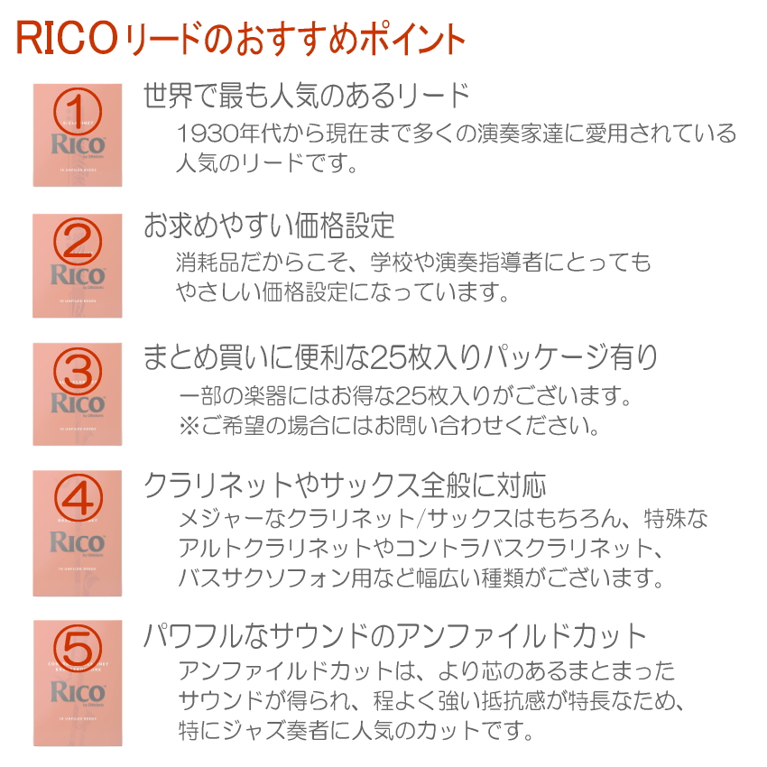 昔から有名で定番のRICOリードは、使いやすさやお手頃な価格から長きにわたり演奏家達に愛されているブランドです。