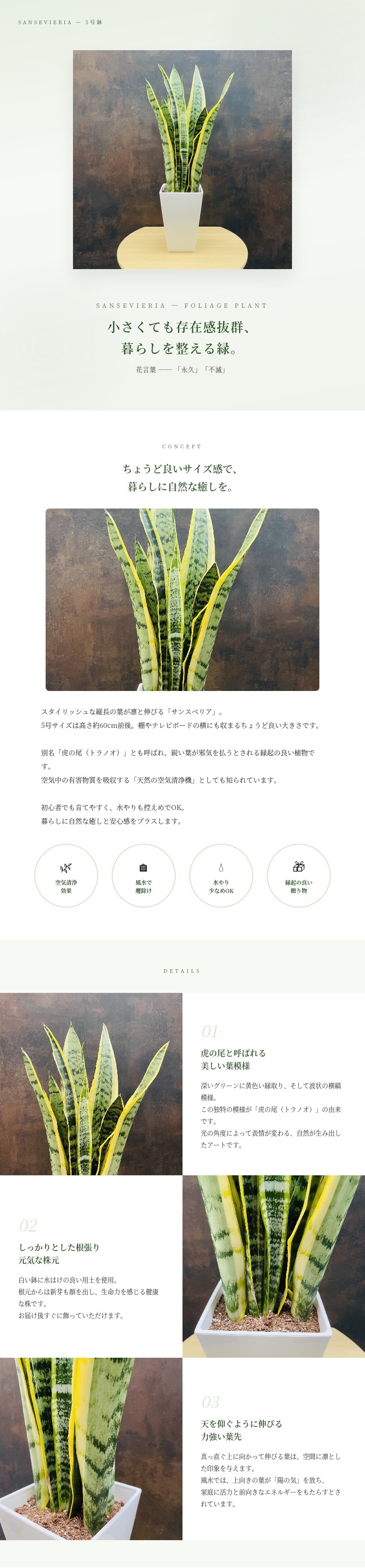 「サンスベリア」の別名「トラノオ(虎の尾)」は、日本では強さや守り神の象徴とされており、「家庭を守る」「悪運から身を守る」などの意味も込められています。