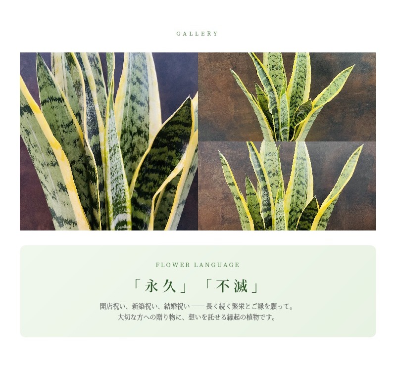 開店祝いや引っ越し祝いにサンスベリアを贈るのは、「新たな門出を守り、繁栄をもたらす」という意味が込められています。