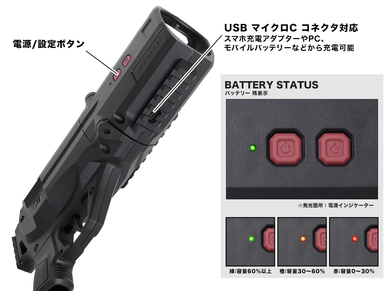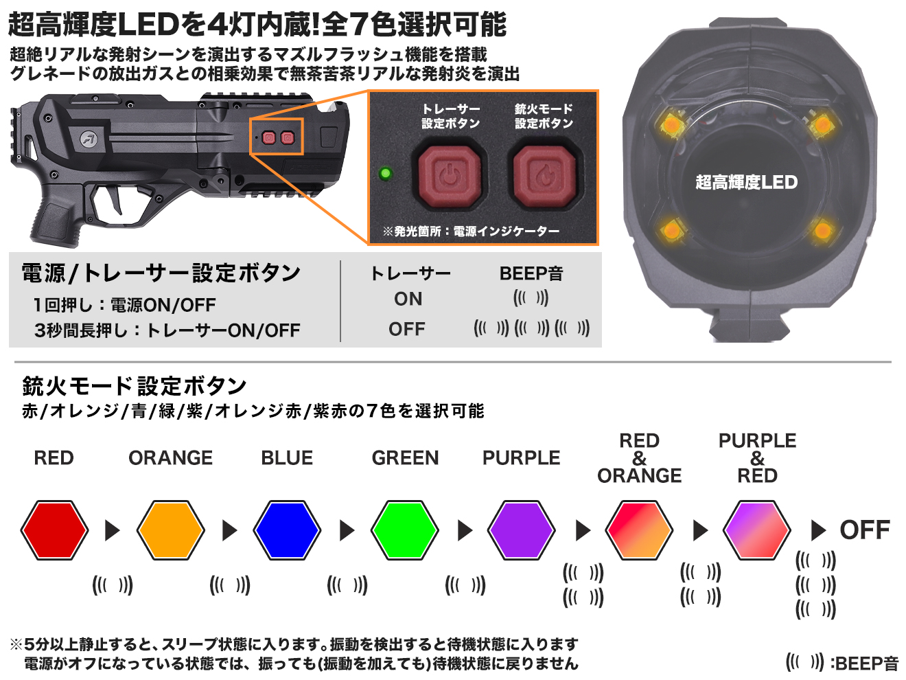 超絶リアルな発射シーンを演出するマズルフラッシュ機能を搭載!超高輝度LEDを4灯内蔵しており直視できないくらいの眩い光が敵を威嚇!グレネードの放出ガスとの相乗効果で無茶苦茶リアルな発射炎を演出します!しかも赤/オレンジ/青/緑/紫/オレンジ赤/紫赤の7色を選択可能となっています。