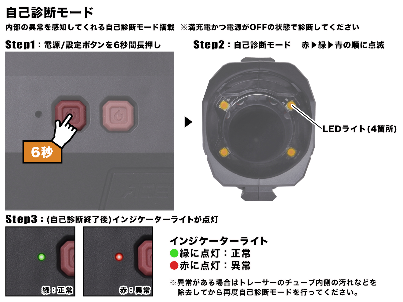 電源オフ時に設定ボタンを6秒長押しすることで自己診断モードを起動できます。センサー周辺のゴミや汚れの付着を検知でき、無駄打ちすることなく正常動作するか確認ができます。