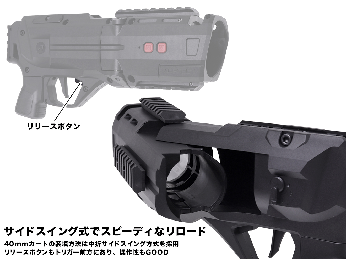 40mmカートの装填方法は中折サイドスイング方式を採用。上下に折れるものよりも素早くカートを取り替えでき、スピーディなリロードが可能となっています。リリースボタンもトリガー前方にあり、操作性もバッチリです。