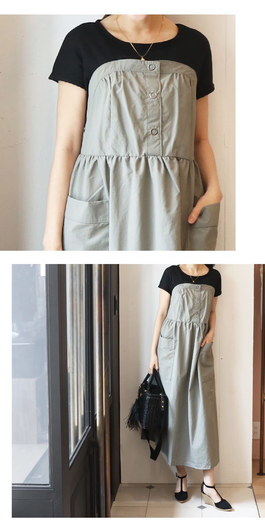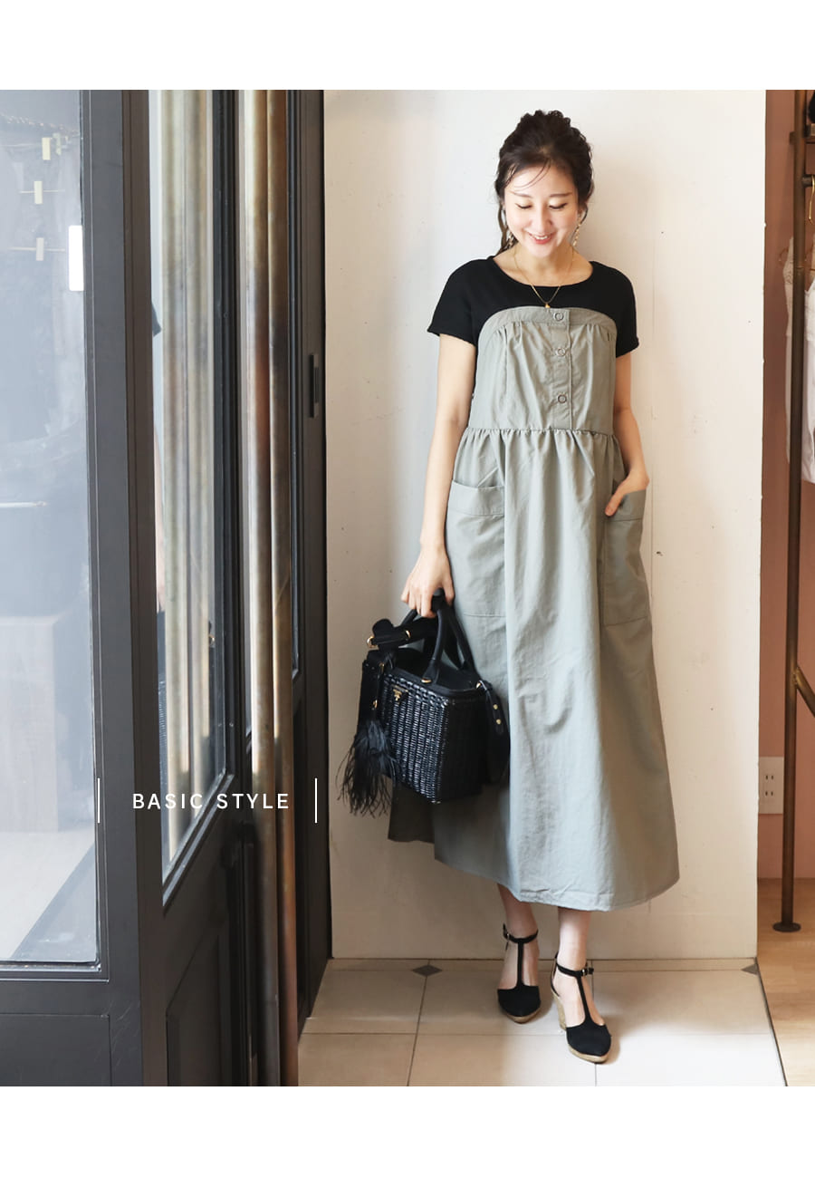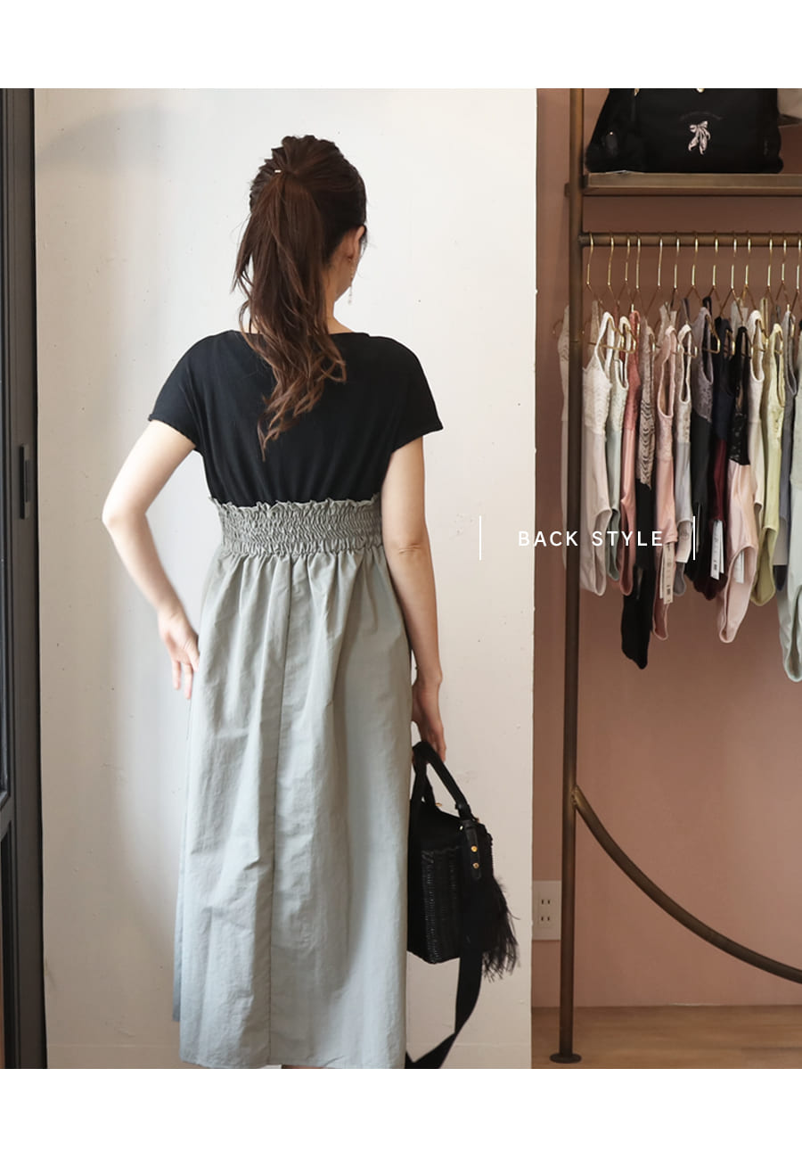 涼し気なフレンチスリーブのカットソーと、軽い着心地のナイロン生地フレアスカートにを合わせた《マタニティ・授乳対応》重ね着風ドッキングワンピースです。