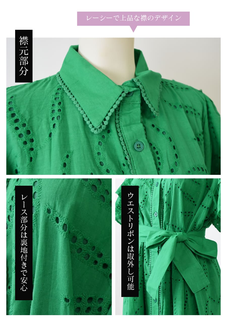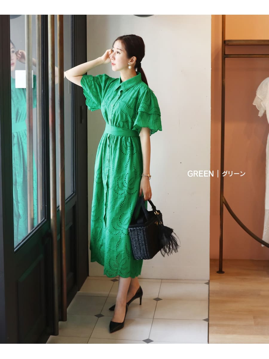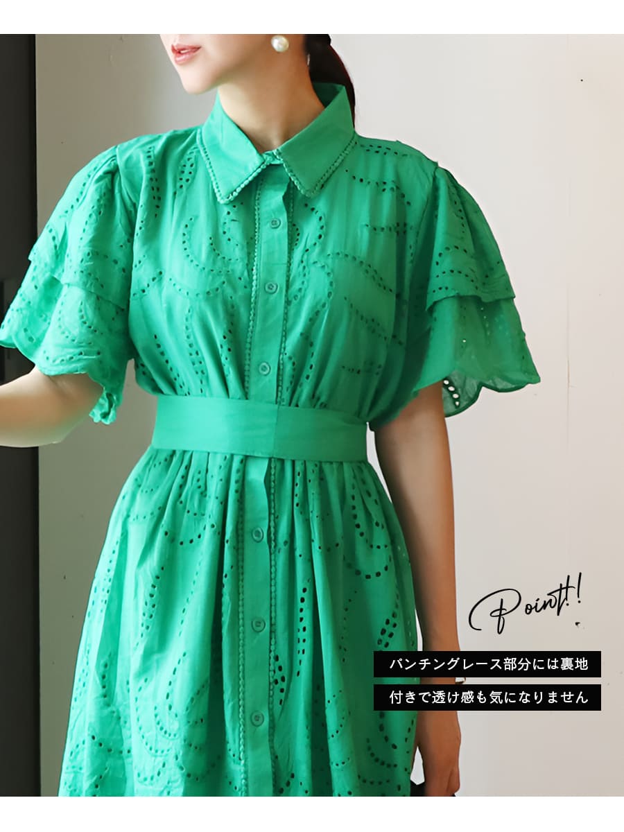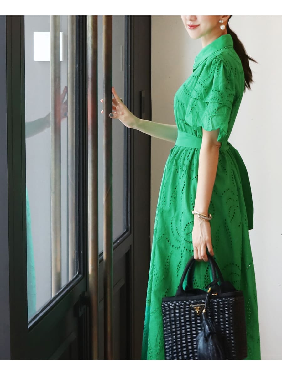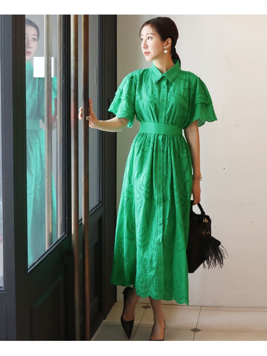 カットワークレースが美しいワンピースは、甘く上品なゆったり広がるフレアーデザイン。