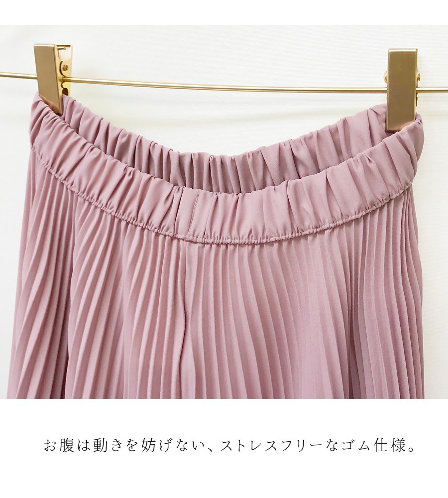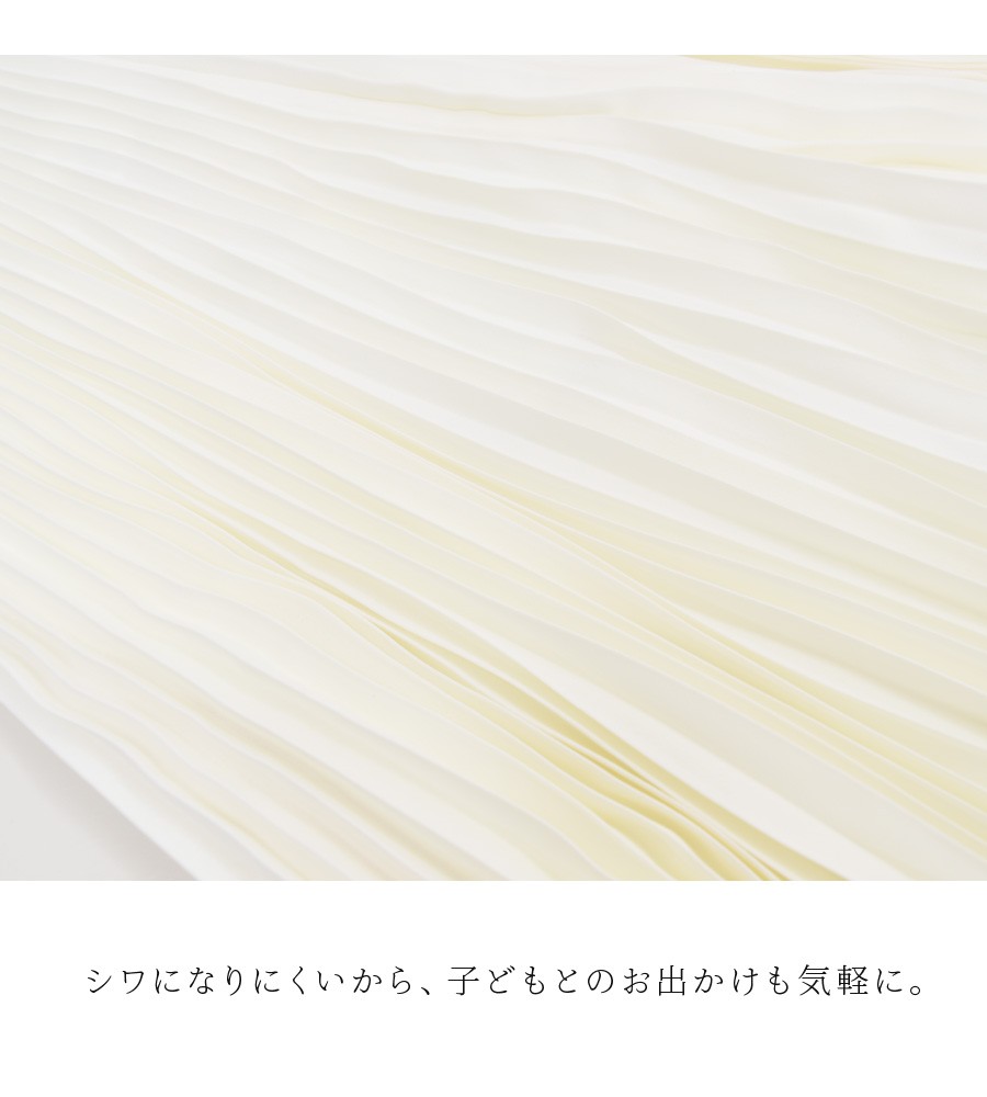 縦に流れる落ち感の綺麗なプリーツが動きに合わせて綺麗にゆれる、女性らしい上品さもたっぷりの一枚。ウエストゴムなのに、動きやすく、またシワにもなりにくいので、子どもとのお出かけにも着やすさ抜群。