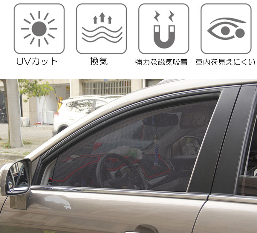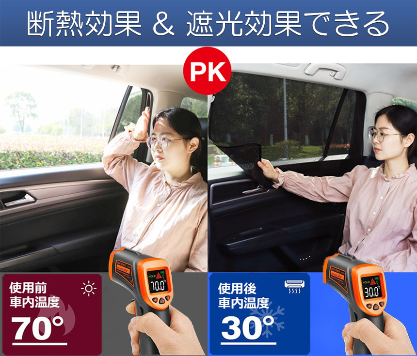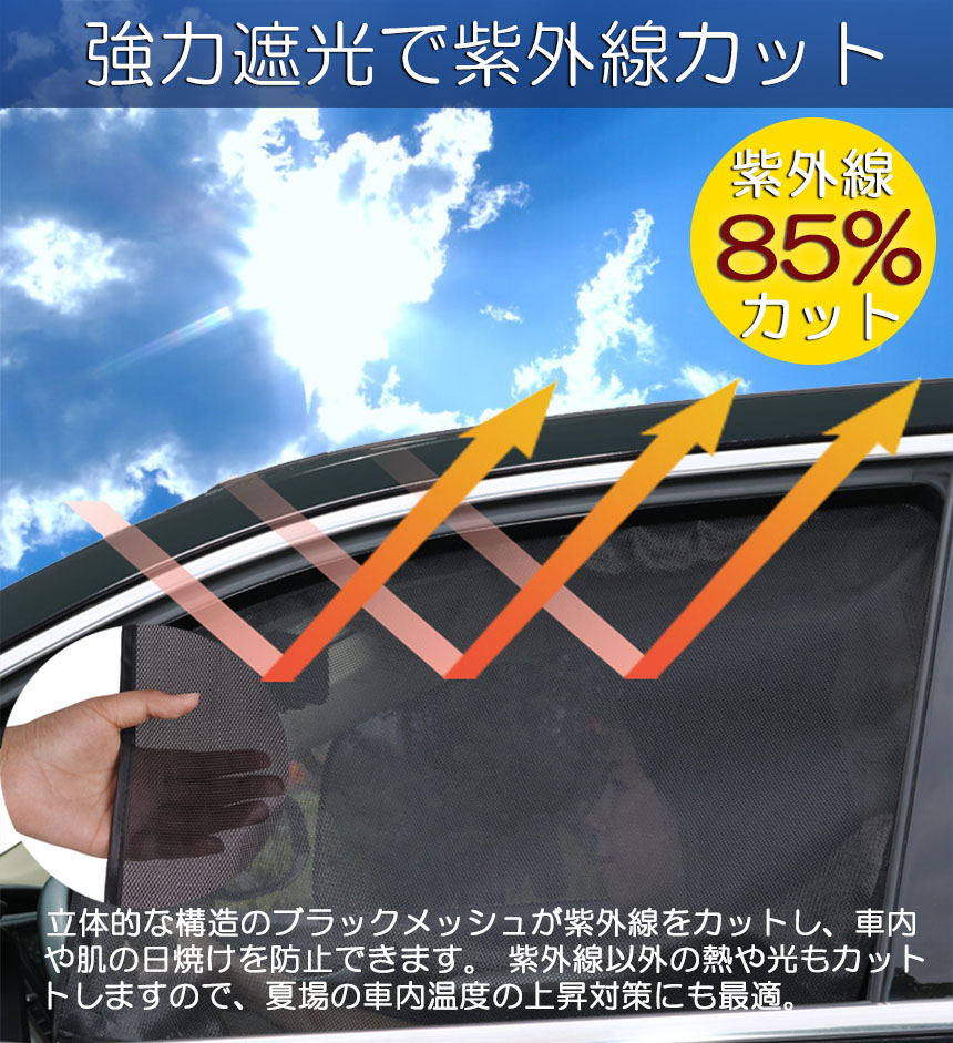 【反射材料】メッシュ構造により車外の景色は内側から見ることができますが、反対側には反射素材を使用しているため、外からの光を反射し内側を車外から見えなくするため、プライバシー保護にも優れています。