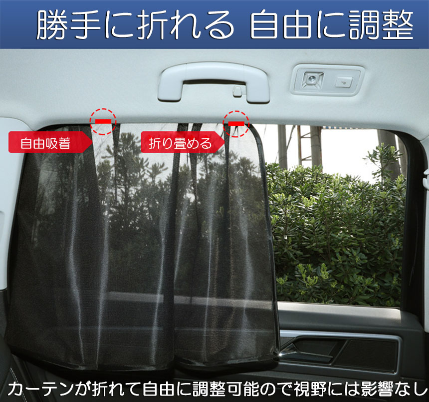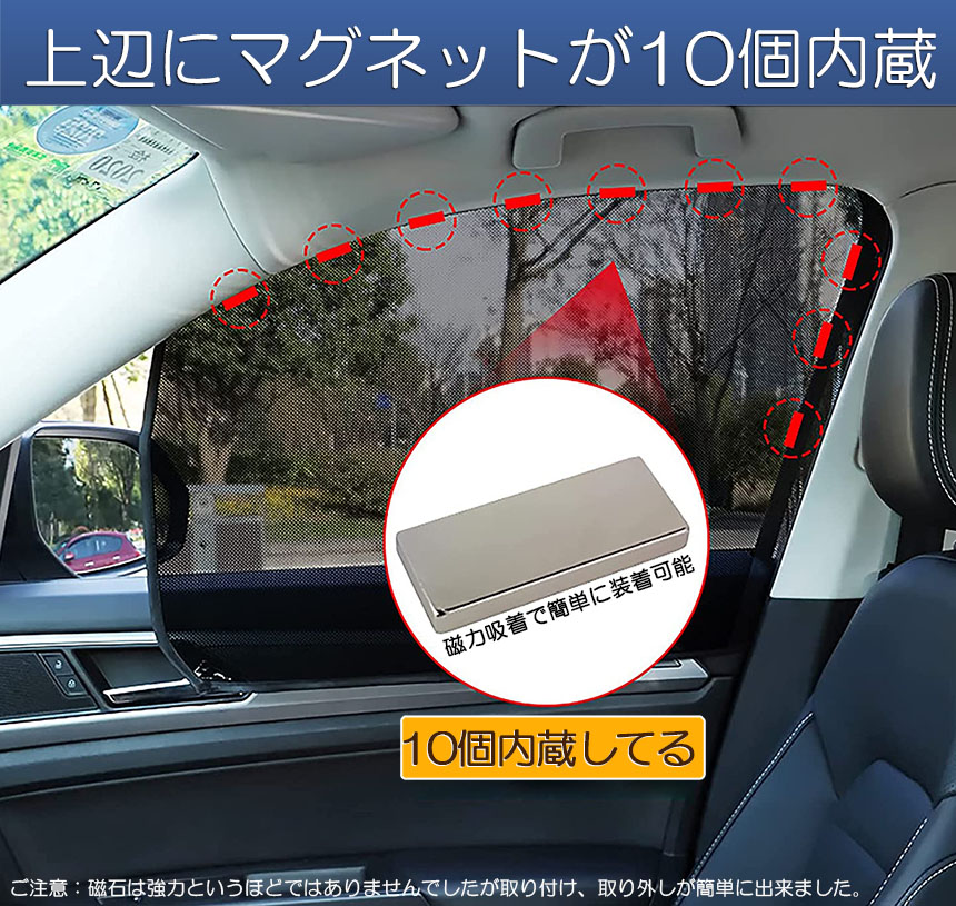 【取付簡単】カーテン上部の10か所にマグネットが内蔵されており、車窓の上部の金属フレームにつけるだけで誰でも簡単に着脱が出来ます。またマグネットの吸着位置を調整することで、設置したまま自由に折り畳むことも可能です。