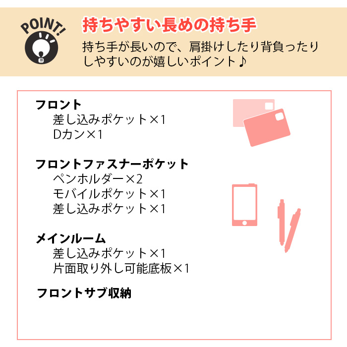 フロントファスナーポケット(内部にペンポケット×2、モバイルポケット×1、オープンポケット×1)