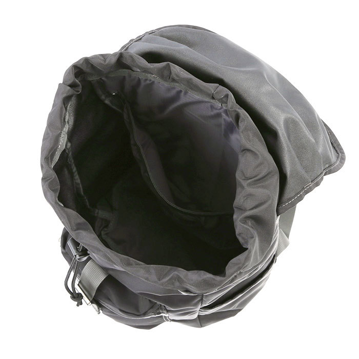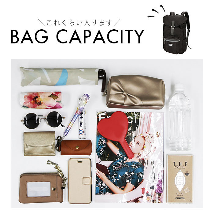 ・女性に使いやすい程よいサイズ感が魅力のフラップリュック。フラップを開いたメイン開口部は、小物の出し入れがしやすい巾着仕様。