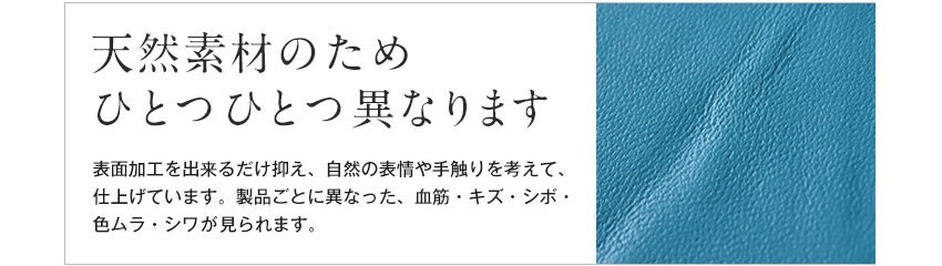 天然素材の為、カラーや生産時期により革の紋がひとつひとつ異なります。表面加工を出来るだけ抑え、自然の表情や手触りを考えて、仕上げています。また、血筋・キズ・シボ(毛穴)・色ムラ・シワが見られますが、それが味となり持ち主の使用頻度に合わせ変化していきます。革は使い込む程、自分だけの[革]へと変化していきます。