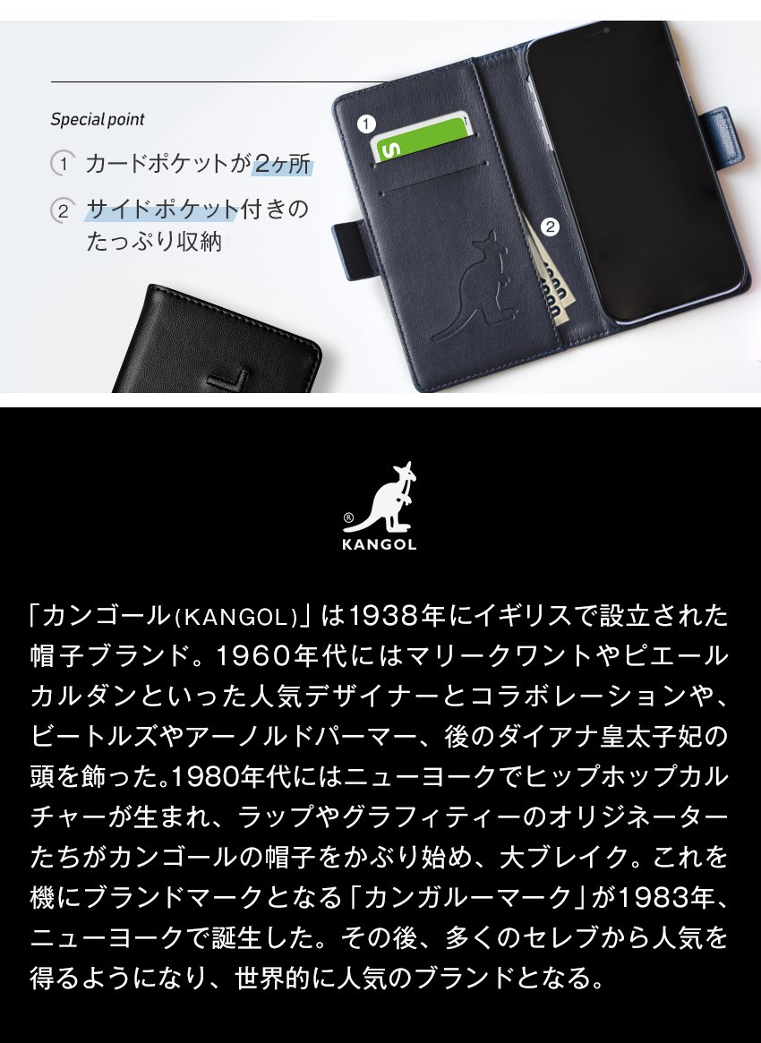 1938年にイギリスで設立された帽子ブランド「カンゴール(KANGOL)」の手帳型スマホケース。ロゴが刺繍されたシンプルでおしゃれなデザイン。ベルトはサイドでとめられるから、見た目にもスッキリ。内側は、ロゴシルエットの上品なエンボスデザイン。カードポケットが2ヶ所と、サイドポケットもあるたっぷり収納。触り心地のよいPUレザーと、内側ケースにはハードタイプを採用し、マットな質感で高級感を感じさせます。