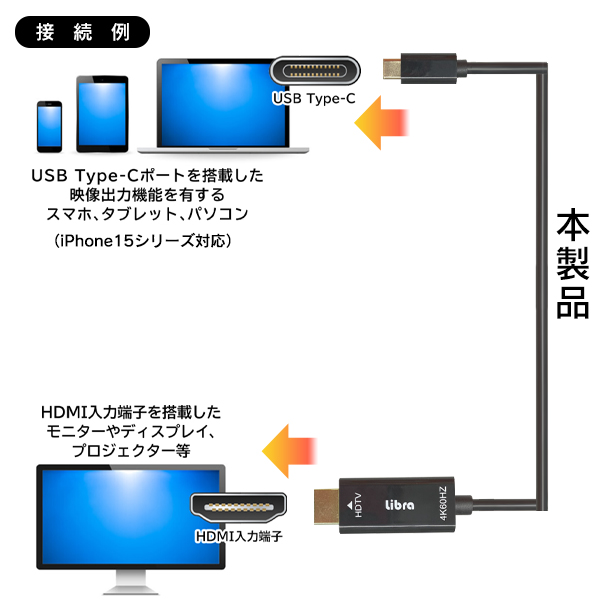 USB Type-C端子を搭載したパソコンやiPhone・iPad・スマホ・タブレットの映像信号を変換し、HDMI入力端子を搭載したディスプレイなどに出力することができます。