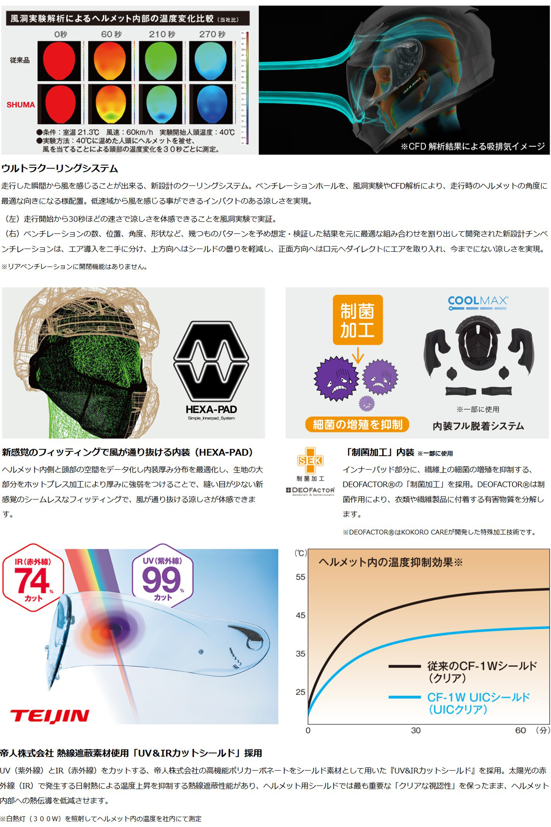 UV(紫外線)とIR(赤外線)をカットする、帝人株式会社の高機能ポリカーボネートをシールド素材として用いた『UV&IRカットシールド』を採用。太陽光の赤外線(IR)で発生する日射熱による温度上昇を抑制する熱線遮蔽性能があり、ヘルメット用シールドでは最も重要な「クリアな視認性」を保ったまま、ヘルメット内部への熱伝導を低減させます