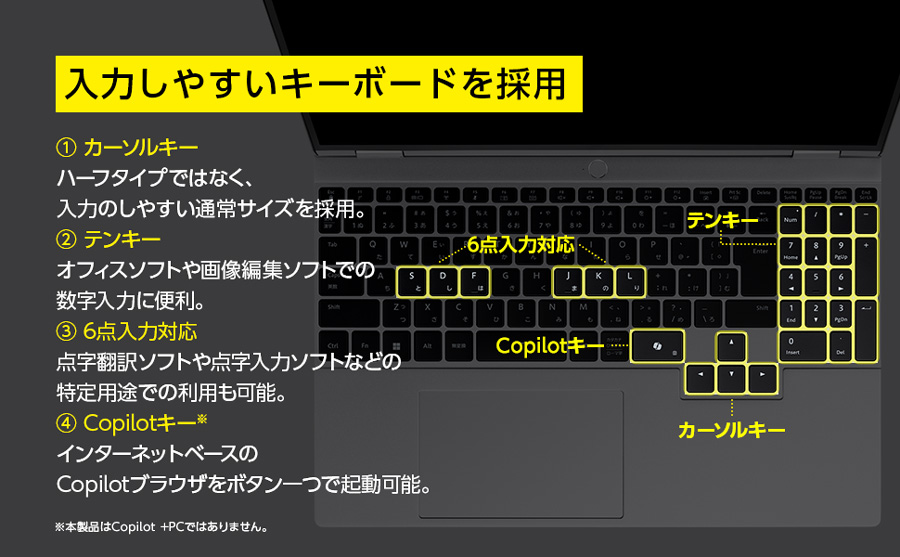日本語キーボード (105キー / キーピッチ約18.75mm / キーストローク約1.4mm / ホワイトLED / 点字用6点入力対応(パーキンス式) / JIS配列)