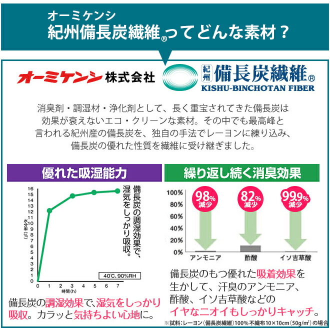 素材 本体:ポリエステル、レーヨン(紀州備長炭繊維(R))、合成繊維(アクリレート系繊維)