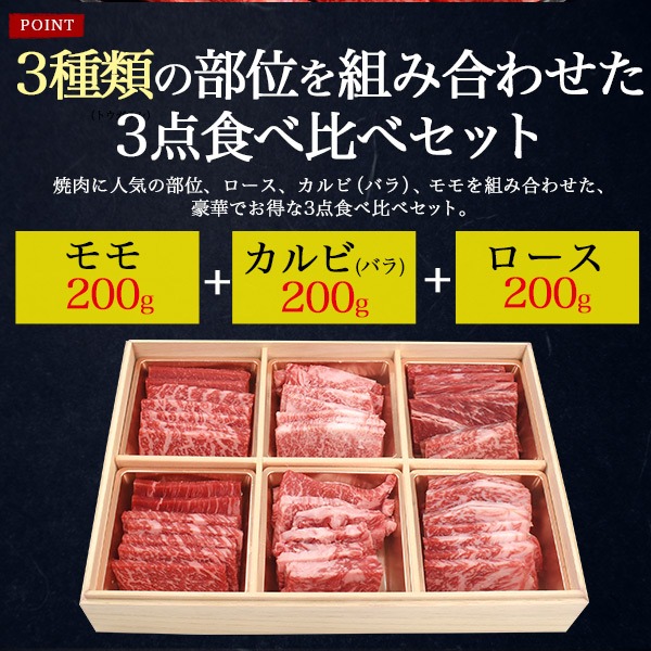 焼肉に人気の部位、ロース、カルビ(バラ)、モモを組み合わせた、豪華でお得な3点食べ比べセットです。