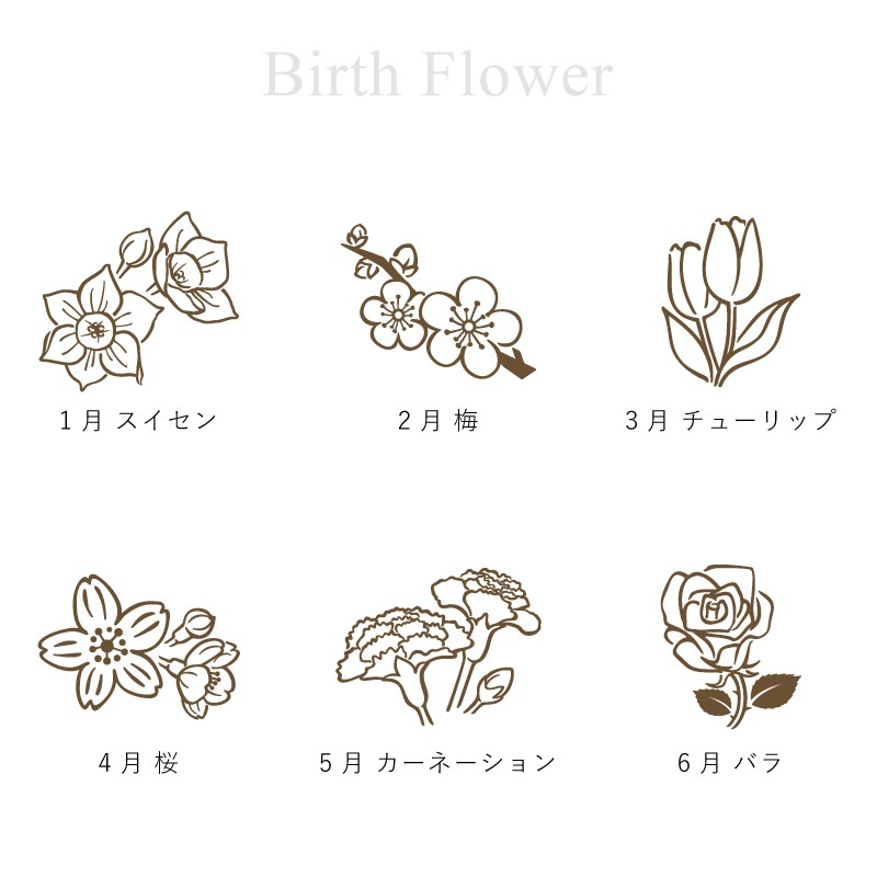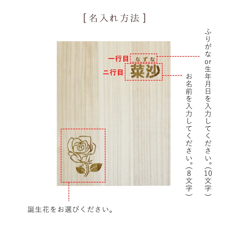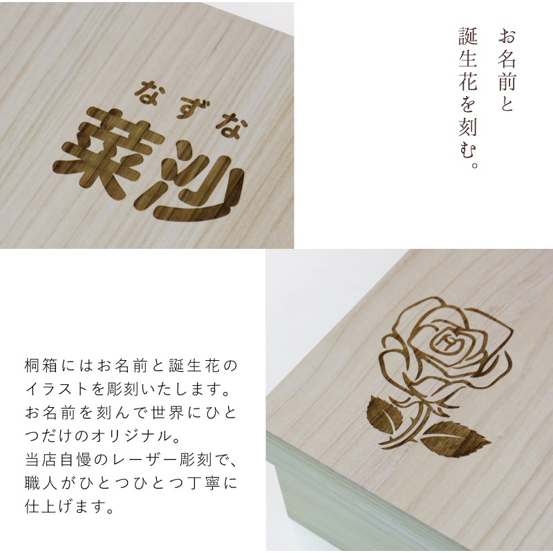 桐箱にはお名前と誕生花のイラストを彫刻いたします。
