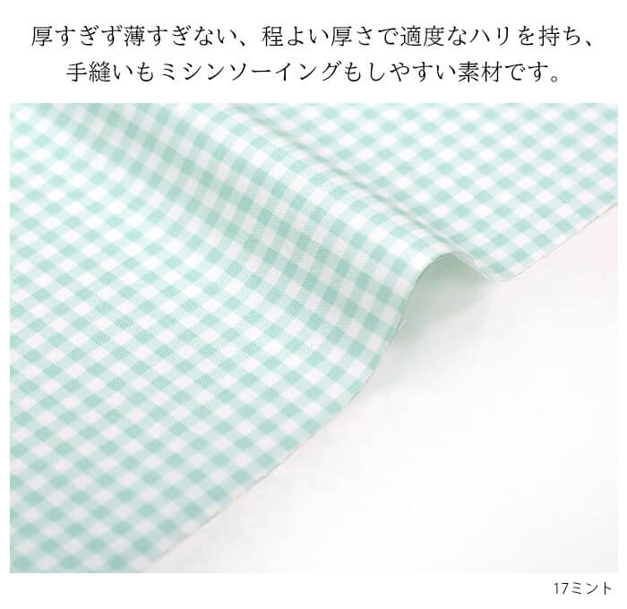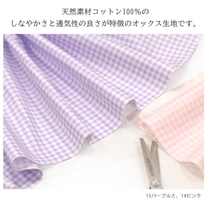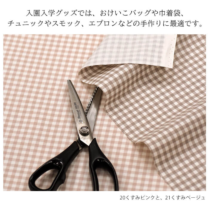 入園入学グッズの手づくりに一番人気のオックス生地のギンガムチェック柄。(5mmチェック)。厚すぎず薄すぎない、程よい厚さで適度なハリを持ち、ミシンでも手縫いでも縫いやすい素材です。コットン100%のしなやかさと通気性の良さから、入園入学用品ではお稽古バッグや巾着袋、クッションカバーなどの持ち物のほか、チュニックやスモック、エプロンなど、身に着けるものの手づくりに選ばれます。