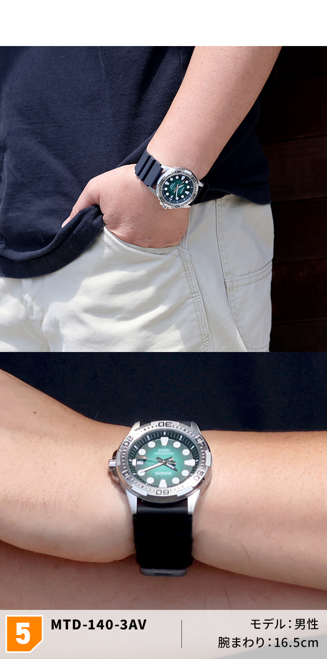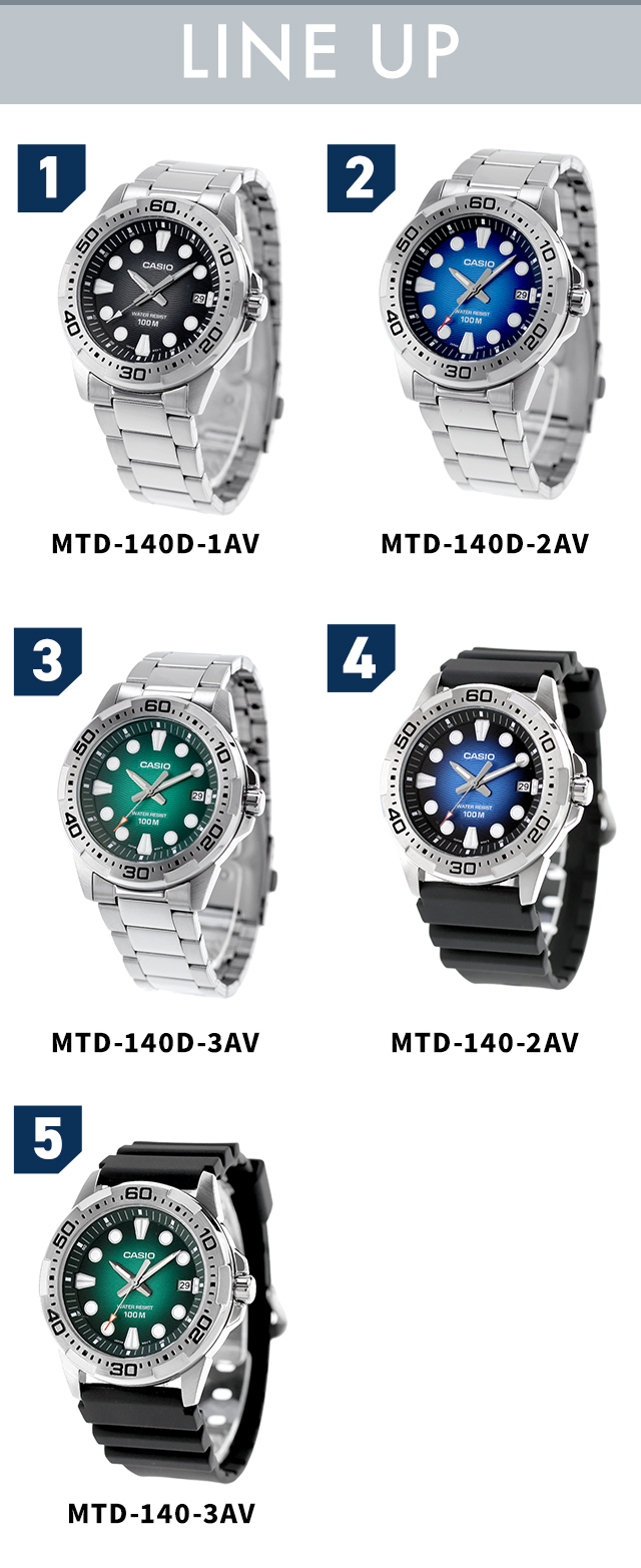 7年保証キャンペーン カシオ チープカシオ CASIO スタンダード クォーツ 電池式 海外モデル クォーツ 電池式 メンズ 腕時計 MTD-140-D STANDARD アナログ ブラック ブルー グリーン 選べるモデル ◆スポーティなデザインが際立つマリンスポーツ向けの腕時計です。100メートル防水機能を備えており、日常使いからマリンスポーツまで幅広く対応します。3時位置には日付表示があり、日常生活の中でも実用性を発揮します。どんなシーンでもスタイリッシュに装えます。ご自身用にはもちろん、誕生日や記念日のプレゼントにもおすすめです。 MTD-140D-1AVDF MTD-140D-2AVDF MTD-140D-3AVDF MTD-140-2AVDF MTD-140-3AVDF 日本未発売モデル