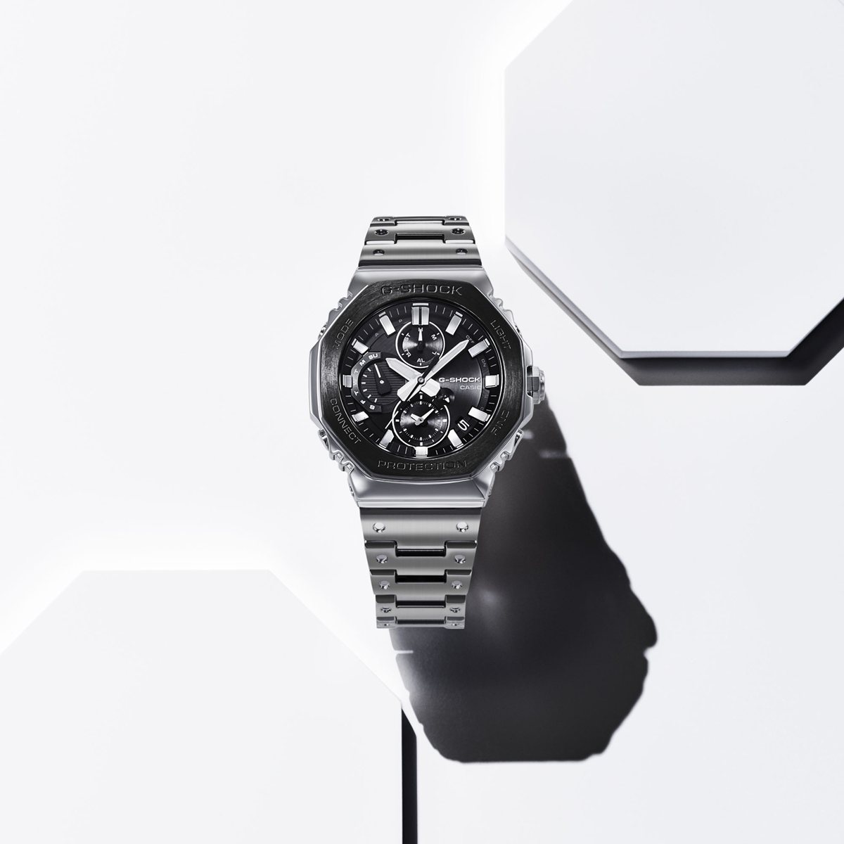 G-SHOCK初代モデル“DW-5000C”の八角形フォルムを受け継ぐGMW-B5000・GM-B2100・GMC-B2100から、その象徴的な八角形トップベゼルにブラックを採用したモデルです。シルバーの中に際立つブラックがG-SHOCKの象徴的な強さを強調しつつ、幅広いスタイルに合わせやすいモノトーンデザインとなっています。GMC-B2100BTは、トップベゼルにヘアライン仕上げを採用し、落ち着いたメタル感を演出。さらに、視認性を高めるためインデックスにはシルバー蒸着を施し、ダイアルとのコントラストを際立たせています。ステンレススチール製のベゼルは、鍛造・切削・研磨といった手間のかかる加工を経て立体的に成形し、美しく仕上げています。フルメタルによる耐衝撃構造を実現するため、ベゼルとケースの間にはファインレジン性の緩衝材を実装。また、メタル製のバンドピースにはディンプル加工を施し、G-SHOCK初号機の樹脂バンドデザインを継承しています。製造は初代G-SHOCKを生み出したマザーファクトリー「山形カシオ」で行われています。
