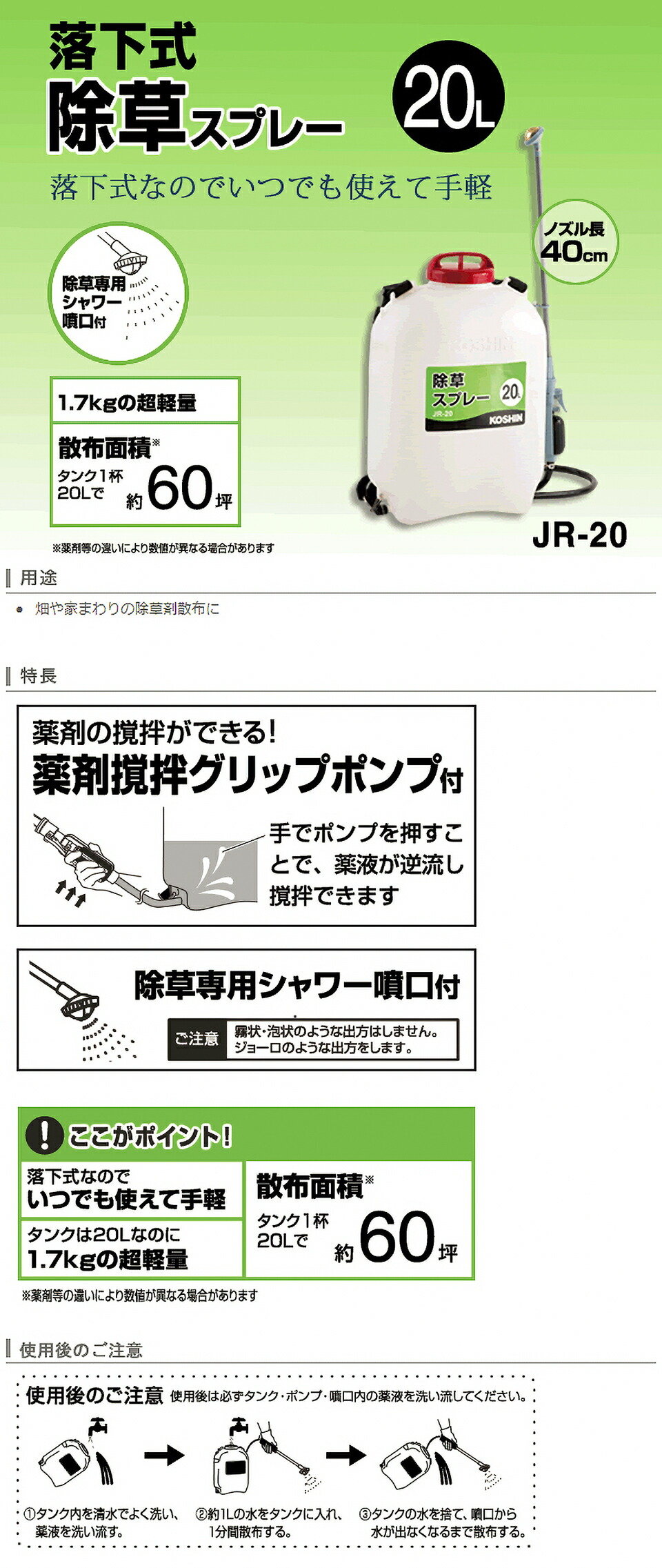 KOSHIN 工進 落下式 噴霧器 除草 スプレー 背負い式 シャワー噴口 20L JR-20 JR20 送料無料
