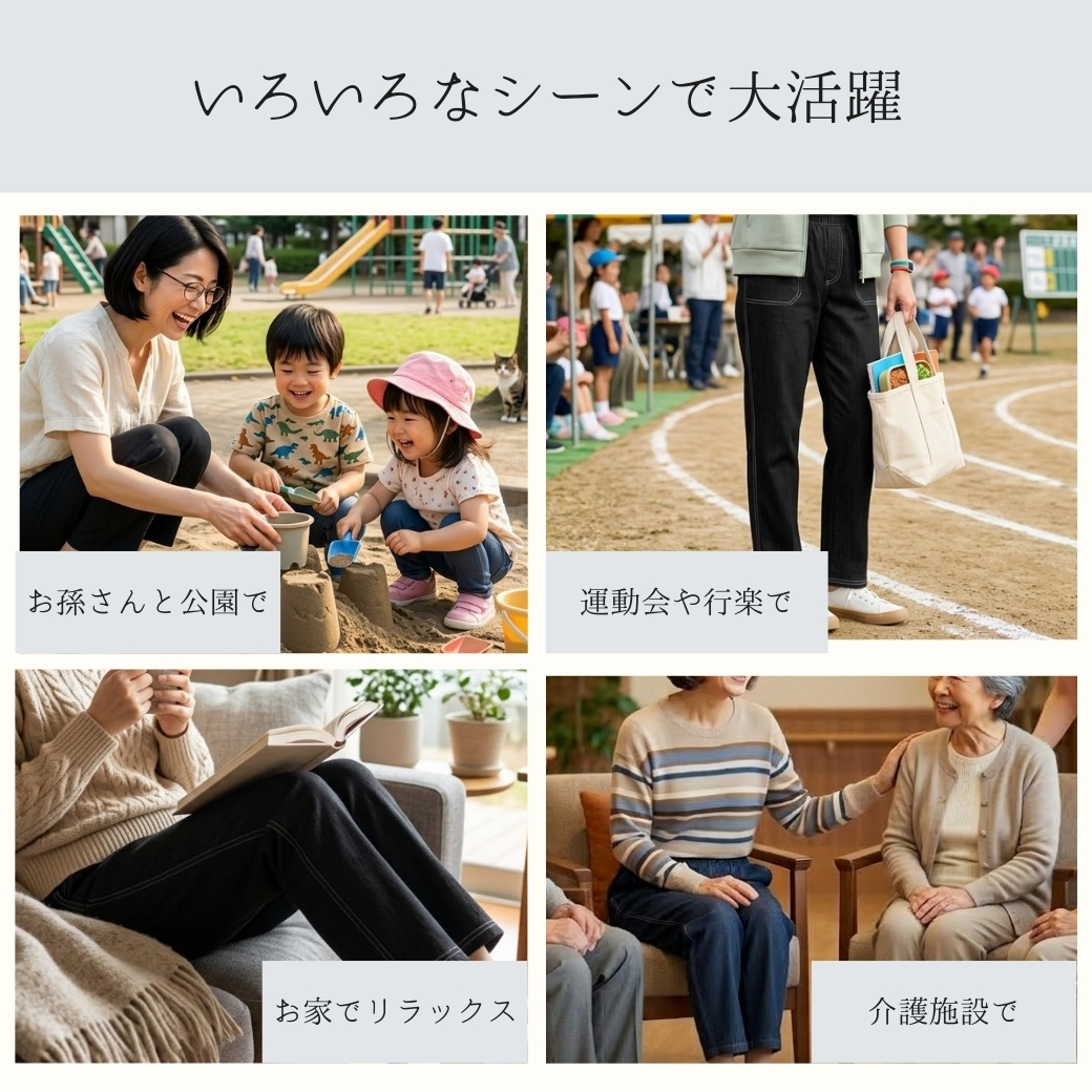 デニムの見た目できちんと感もあり、 外出・通院・デイサービスにも安心です。