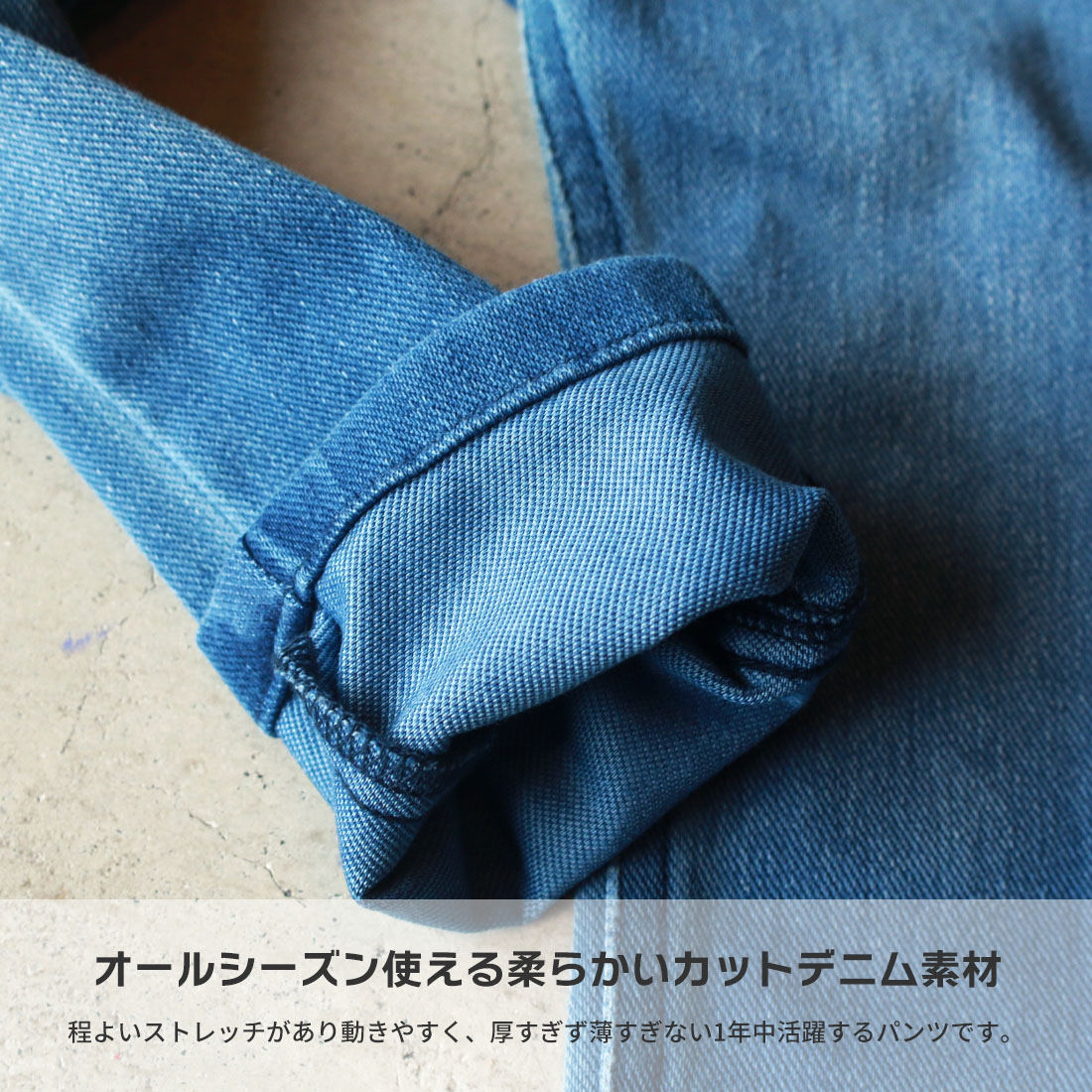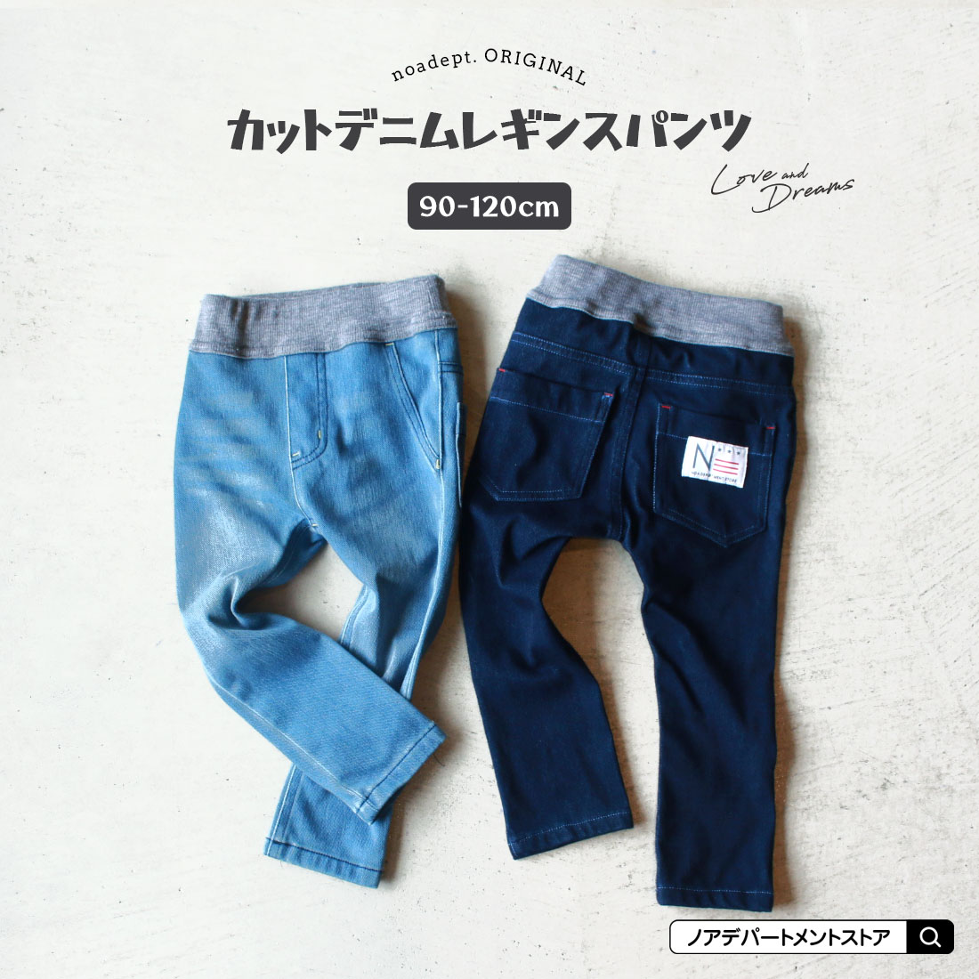 当店人気カットデニムシリーズに、すっきりシルエットのレギンスタイプが新登場!オールシーズンお使いできる柔らかいデニム素材で、程よいストレッチもあるので足の曲げ伸ばしもストレスなく動き回るキッズたちにぴったり。細身のお子様にもおすすめです◎
