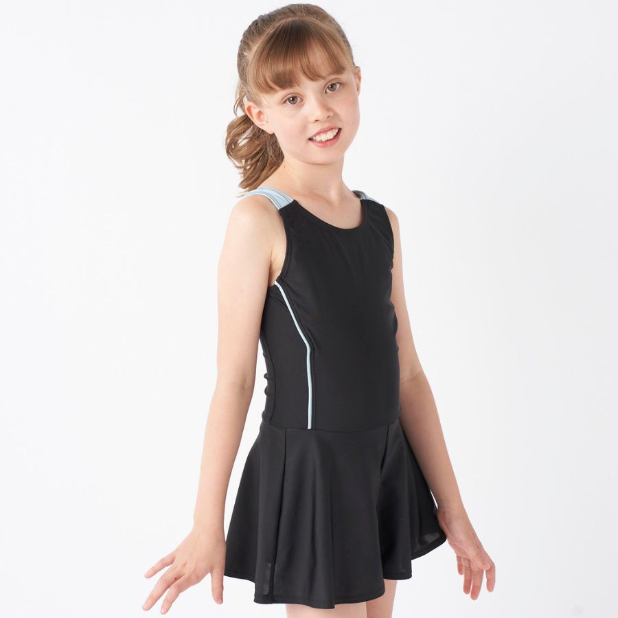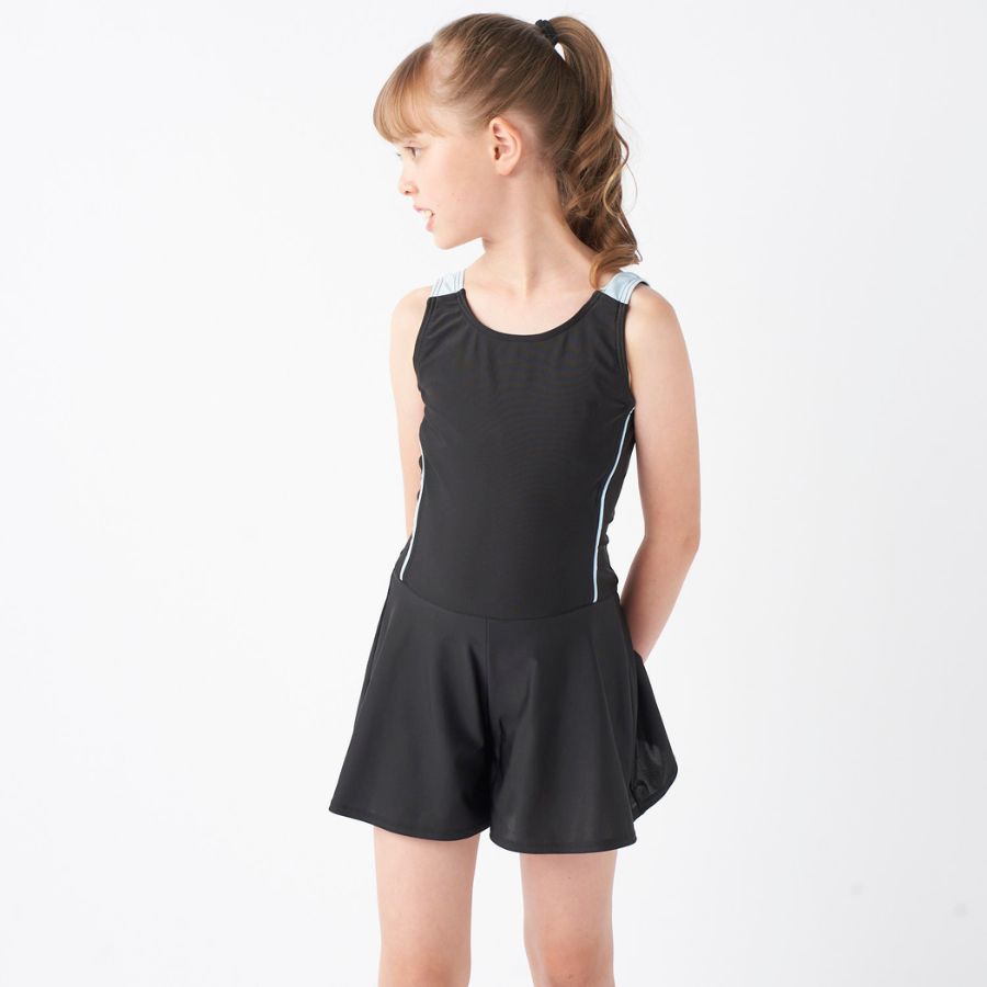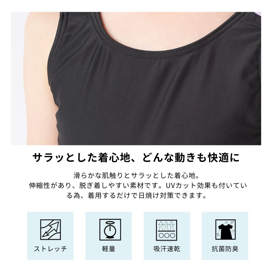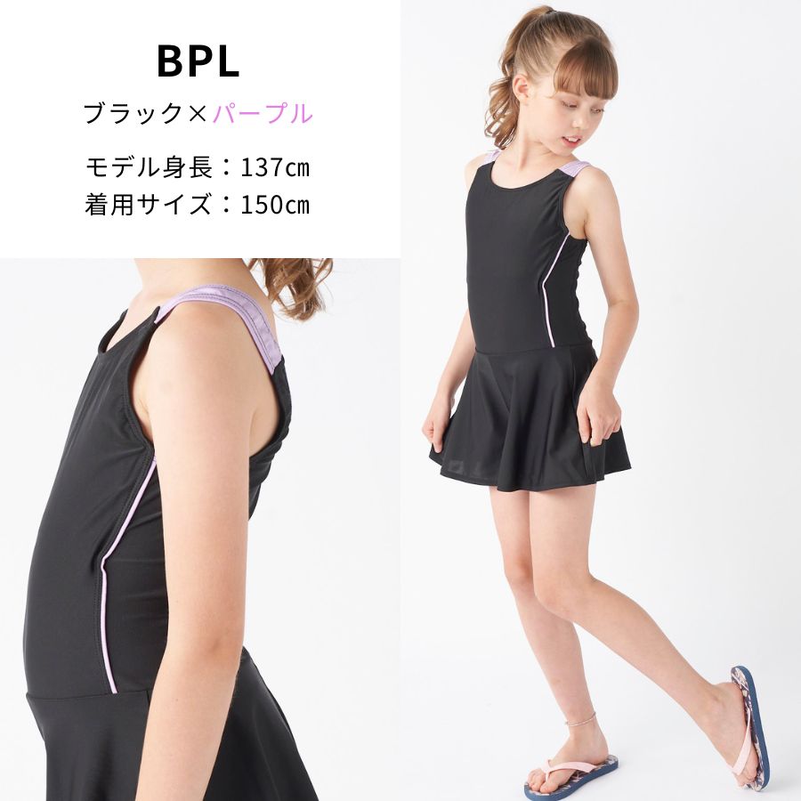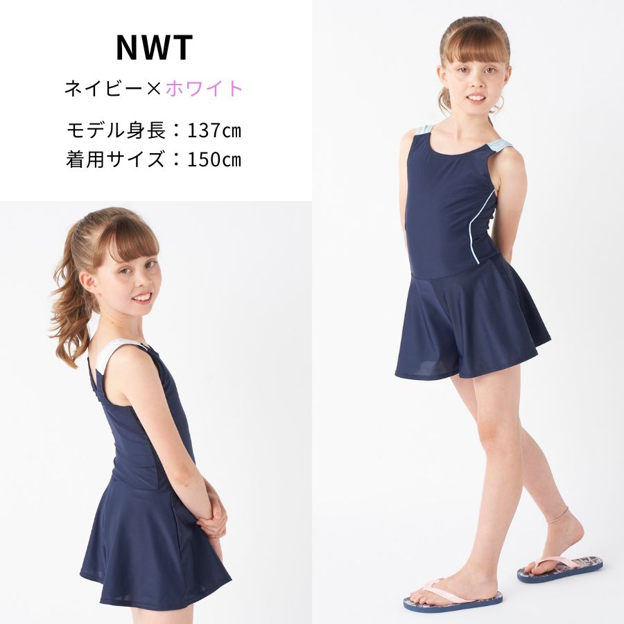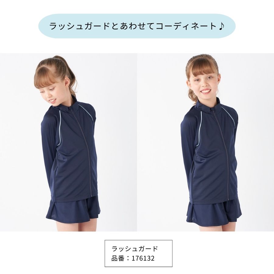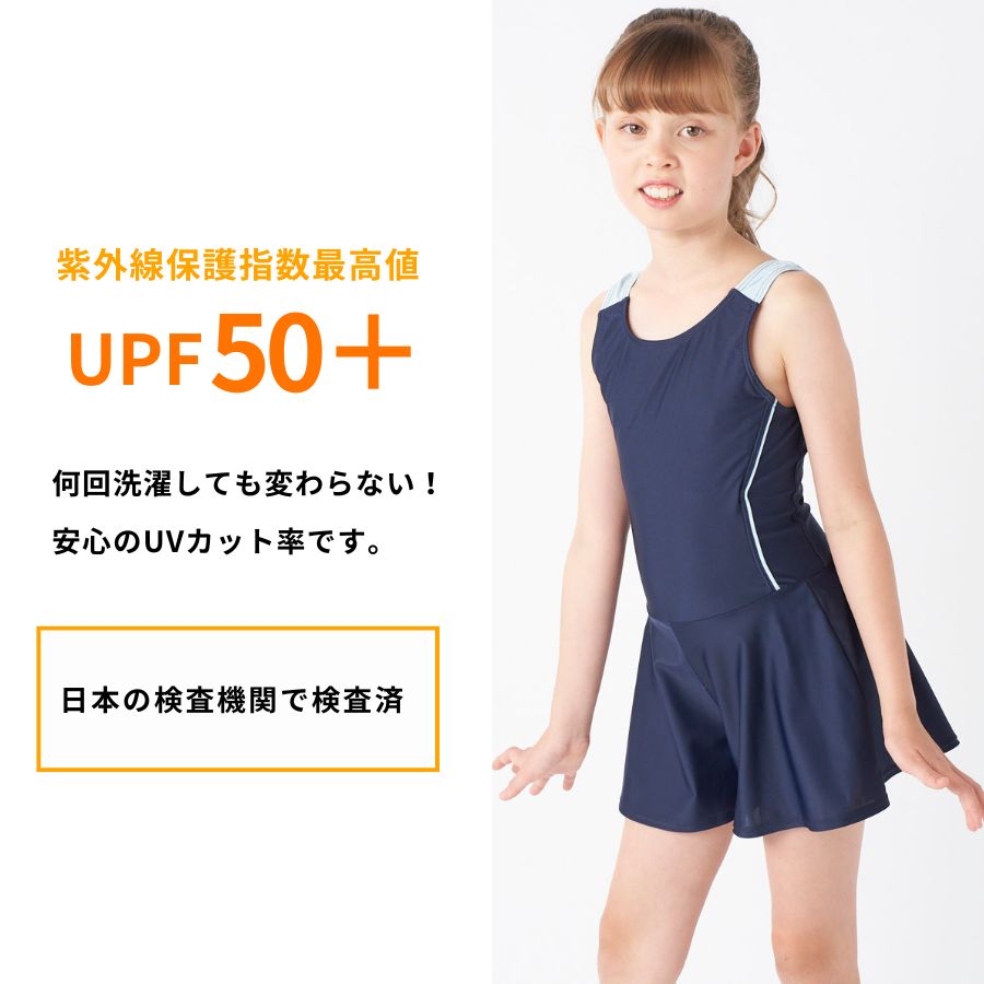 【キュロットワンピース】広がりすぎないAラインのキュロット部分がヒップラインを可愛くカバー。インナーが一体になっているので水中でもめくれ上がらない設計です。【UPF50+】紫外線遮蔽率90%以上、UPF最高値の生地を使用しており、紫外線をブロックします。【素材】伸びて動きやすい素材を使用。胸元・クロッチ部分には柔らかい裏地が付いています。【差込カップ対応】140以上のサイズには、裏地にカップを入れられるポケットが付いています。カップ別売り