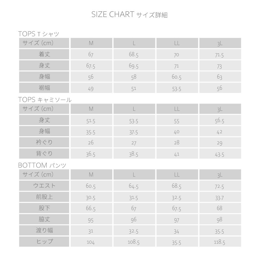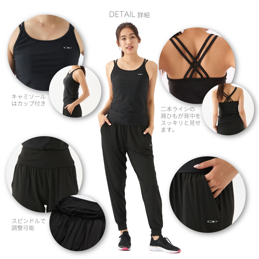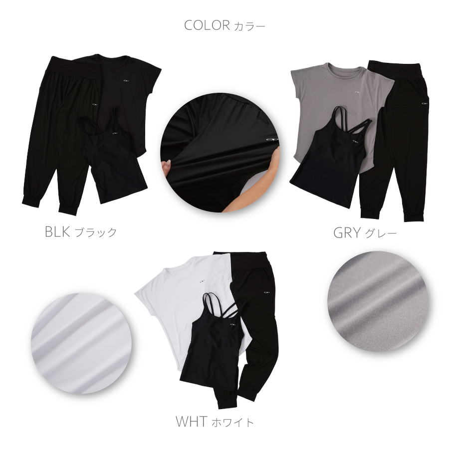 Tシャツ:ポリエステル100% パンツ:ポリエステル85%,ポリウレタン15% キャミソール:ポリエステル91%、ポリウレタン9%