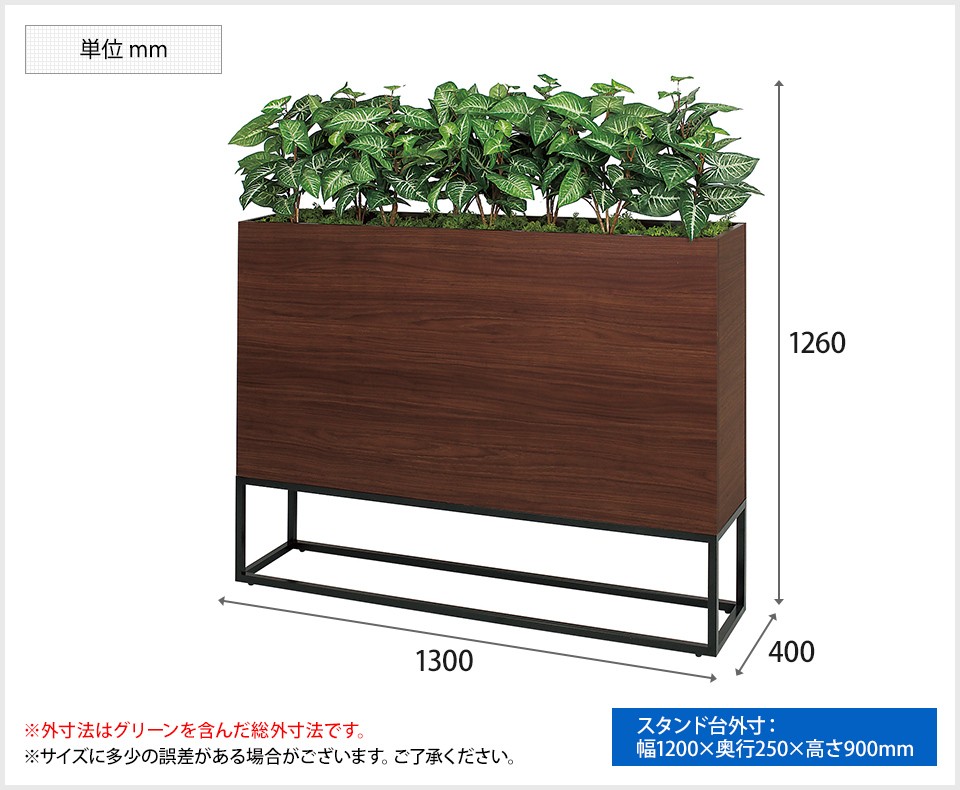 木目のBOXとアイアン風の脚がインテリアに合わせやすいボックスプランターです。スタンダードなデザインで、連接に向いた仕様になっています。フードコートや食堂の通路、テーブルの仕切りやオフィスのロビー、ワークスペースと打ち合せスペースの仕切り、ショップのエスカレーター横に休憩スペースを設ける際の仕切りなど、多くの場所でお使いいただけます。人工グリーンなのでお手入れ不要、手軽で衛生的です。