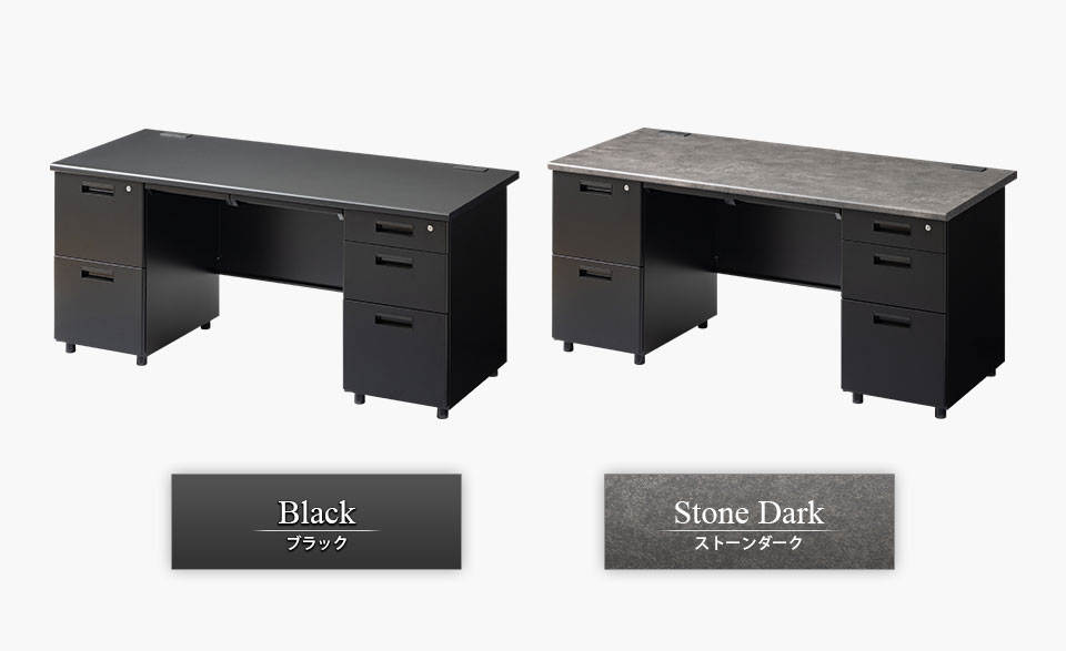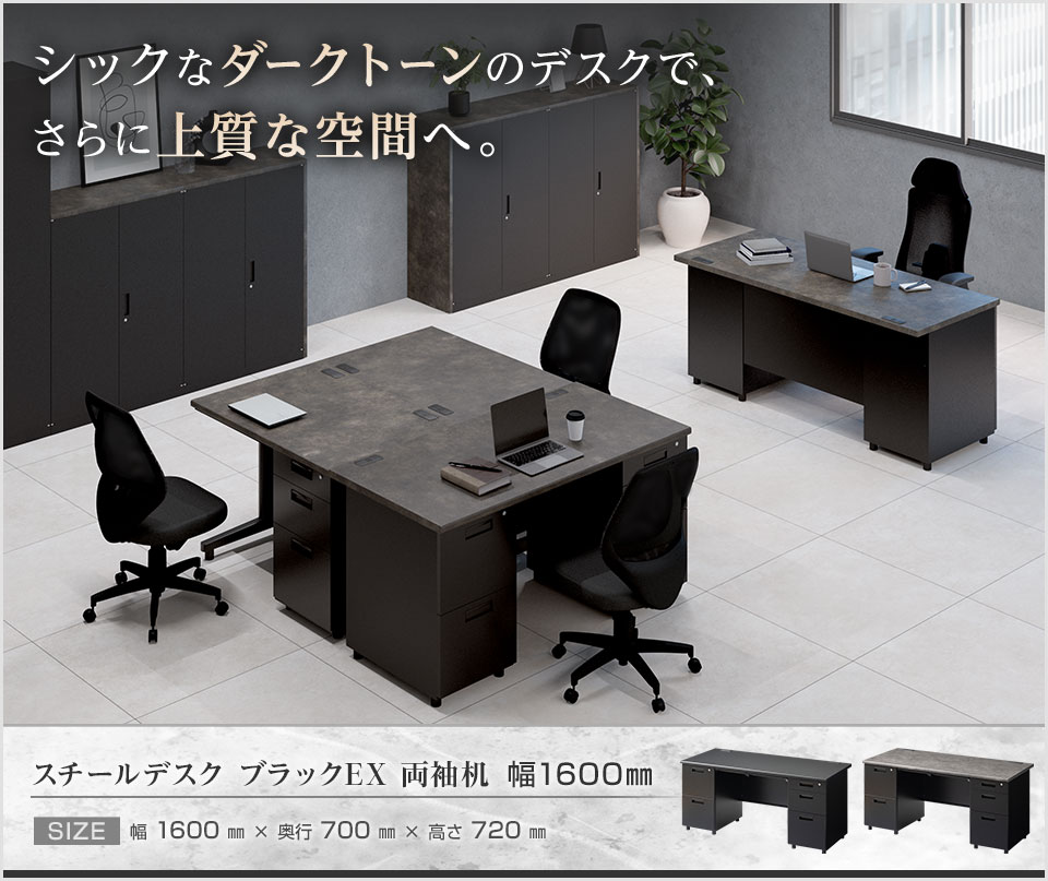天板から側板まで、高級感あふれるダークトーンで統一した「スチールデスク ブラックEX」。デスクの両側に引き出し収納を備えた両袖机です。頑丈なスチール製で、天板は「ブラック」「ストーンダーク」の2タイプ。黒を基調にしたシックな外観が、モダンで洗練されたオフィスや、役員や管理職といったエグゼクティブにもふさわしい特別な空間を演出します。引き出し部分は一括で全段施錠できるオールロック錠を搭載。大切な書類もしっかりと管理できます。