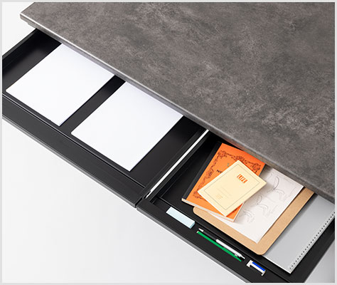 手元には、サッと文具や書類などを収納できる薄型の引き出し付き。A4・A3のファイルを楽々収納できるサイズ感です。