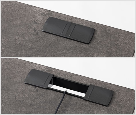 パソコンや電話などのコードを通せるフタ付きコードホールを備えています。使用する時はフタをスライドして、すっきりとまとめて配線できます。