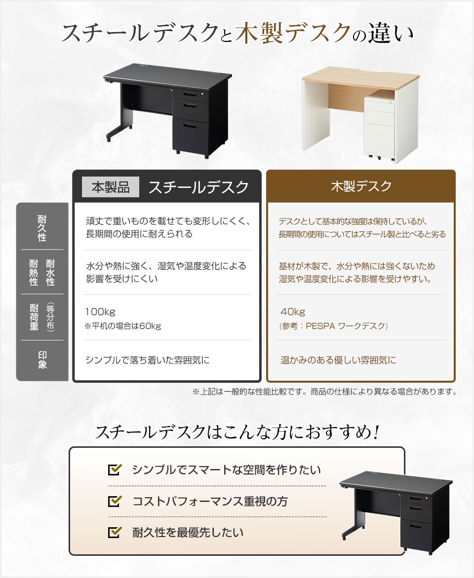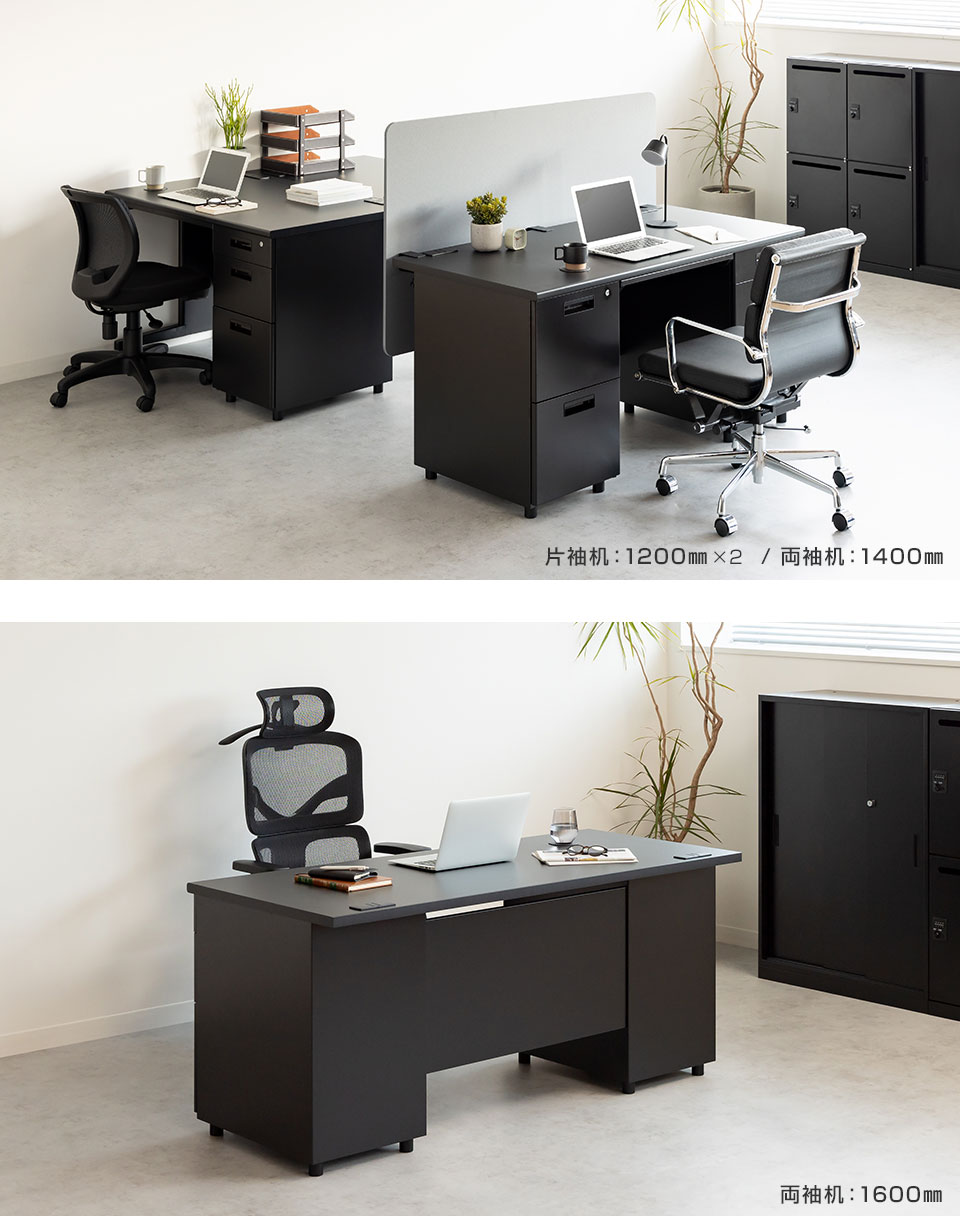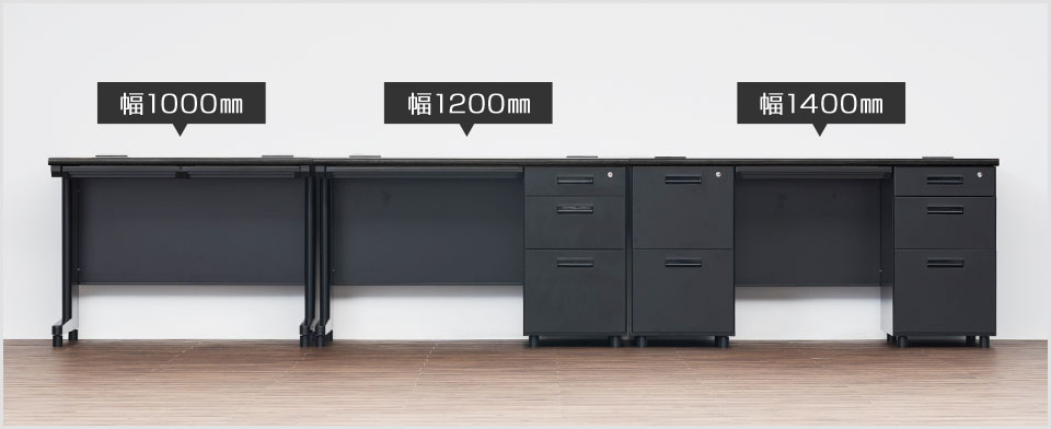 デスクは幅1000、1200、1400、1600mmの4サイズ。平机・片袖机・両袖机の3タイプをご用意。用途に合わせてお選びください。