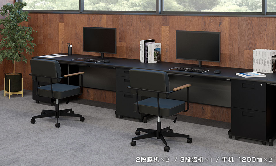 ダークトーンの配色は空間を引き締め、集中しやすい環境を整えます。横並びに配置するなど、レイアウトはお好みで。