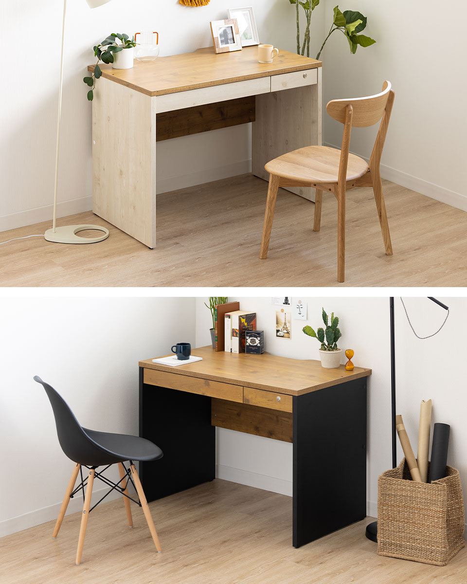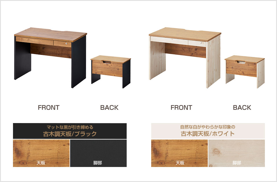 リアルな古木調の天板は、木目のような表面加工を施したやさしい手触り。視覚と触覚、双方に自然な温かみを感じさせる仕上がりです。マットブラックの脚部は、引き締まったシックな印象のカラー。ホワイトアッシュの脚部は、思わず触れてみたくなる温もりのある雰囲気に。シンプルなシルエットだからこそ、デザイン性が際立つ木製ワークデスクです。