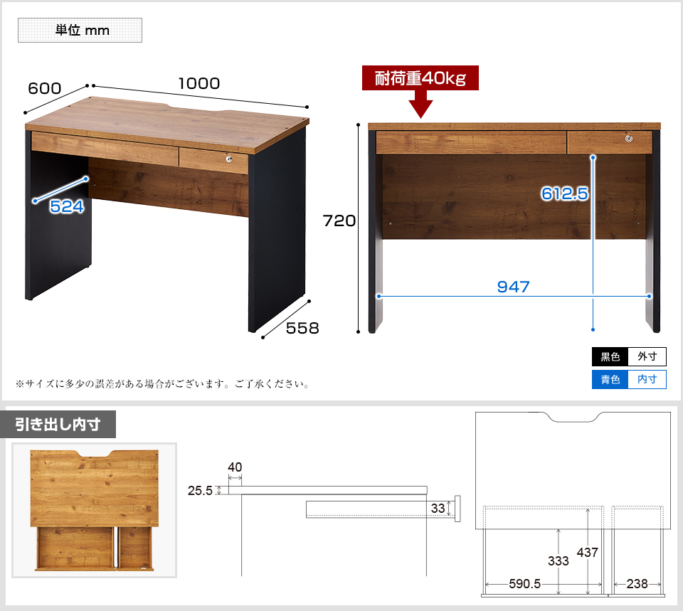 天板:40kg、引き出し内(大)3kg、(小)2kg