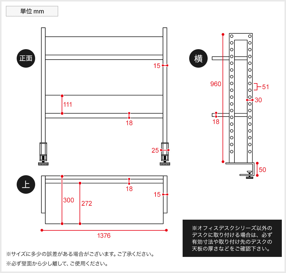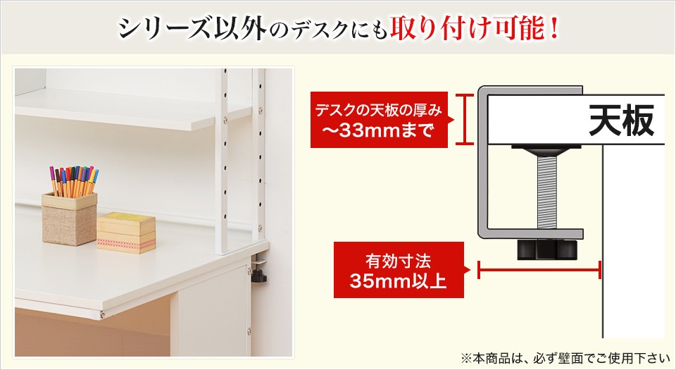 天板の厚みが33mmまで、有効寸法が35mm以上であれば、どのデスクにも取り付けられるクランプ式ラック。オフィスデスクシリーズに限らず、様々なデスク周りの収納力と利便性を向上します。