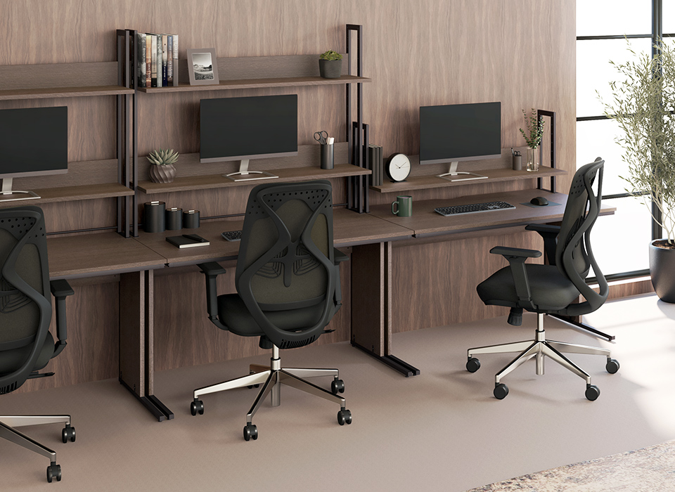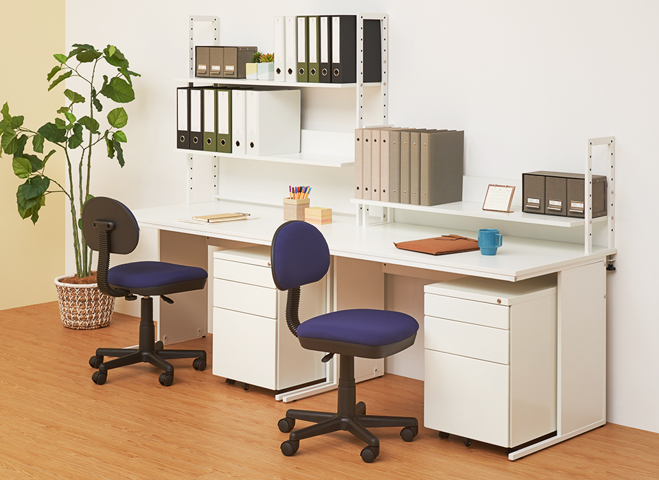 高さ調節ができる棚を2段搭載し、デスク上を大容量収納スペースとして活用できる机上ラック。目の前からサッと取り出せるのでデスクワークがはかどります。普段使いの小物から、ファイルや資料まで収納できるので、作業効率がぐっとアップ。スタンダードなカラーからインテリア性の高いバイカラーまで、様々なオフィスに使っていただける4色をご用意しました。