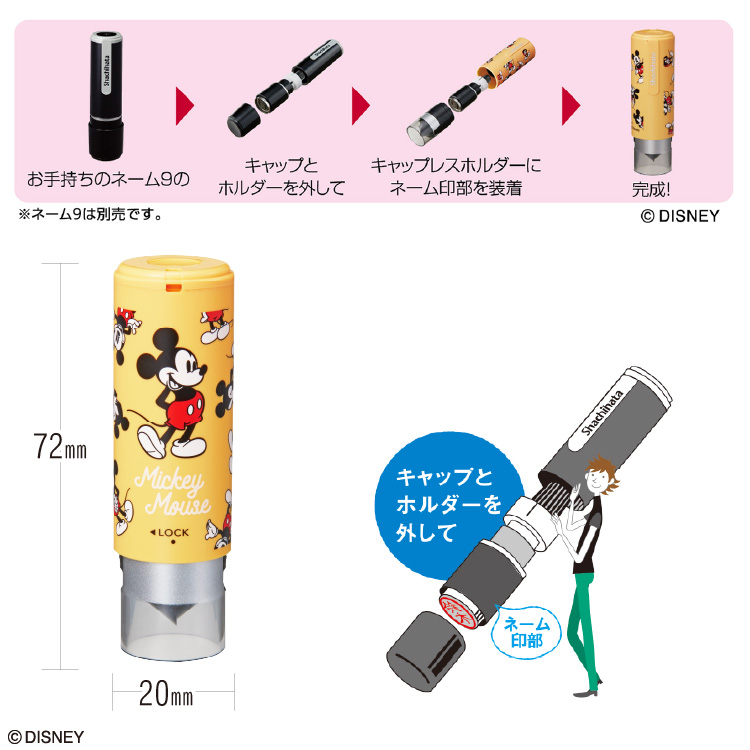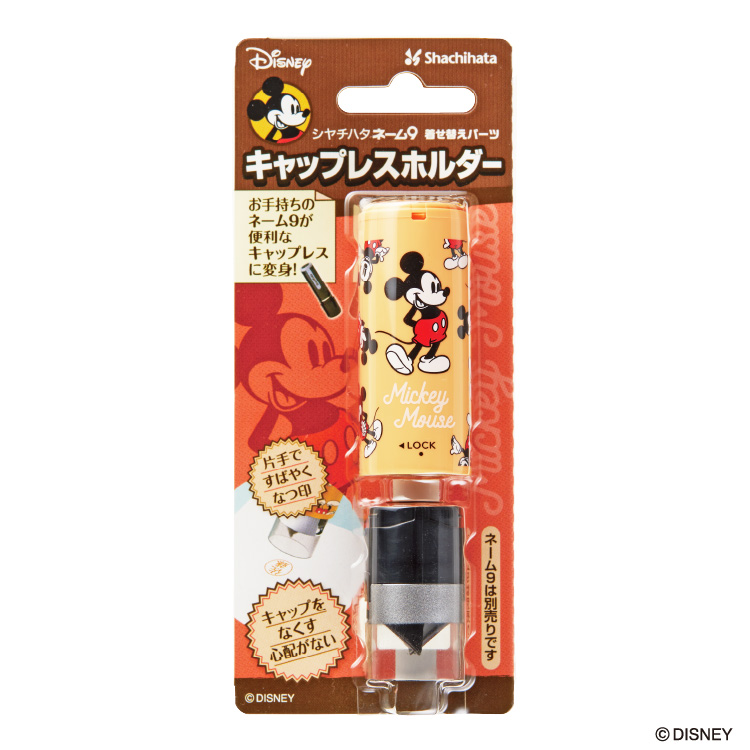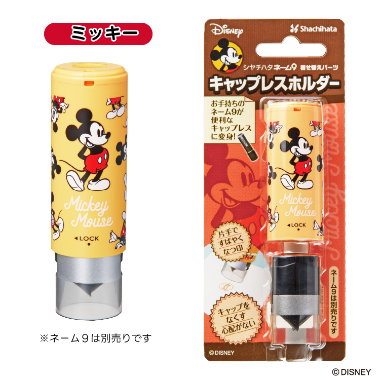 ディズニーキャラクターシリーズ「ネーム9 着せ替えパーツ キャップレスホルダー」は、お手持ちのネーム9に装着することで、便利なキャップレスタイプにできるネーム9専用のパーツです。