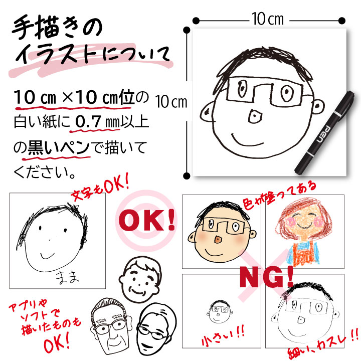 10センチ×10センチ位の白い紙に0.7ミリ以上の黒いペンで書いてください。