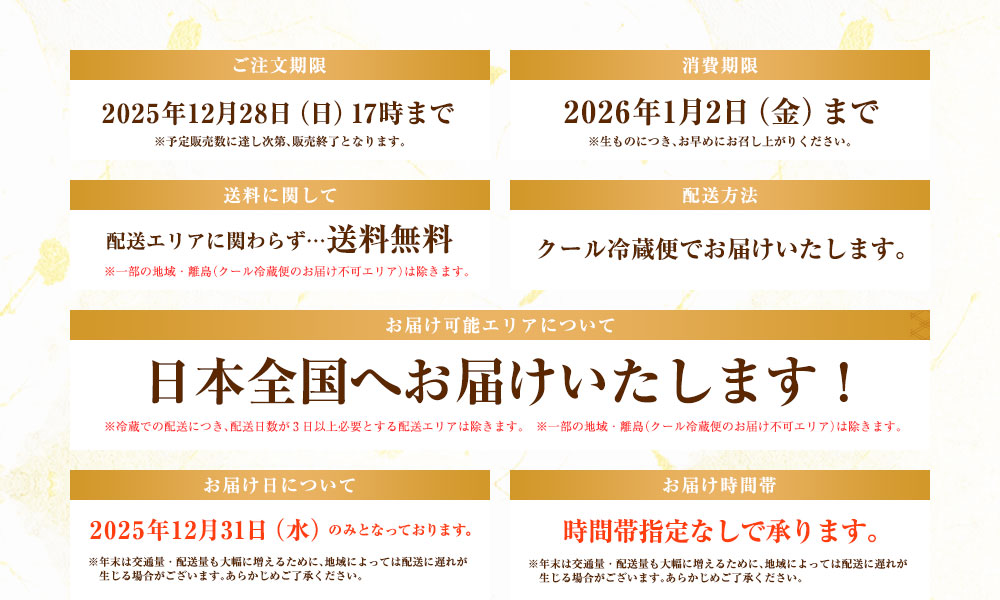 ※年末は交通量・配送量も大幅に増えるために、地域によっては、配送に遅れが生じる場合がございます。あらかじめご了承ください。