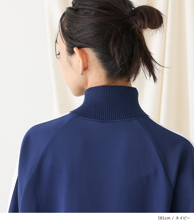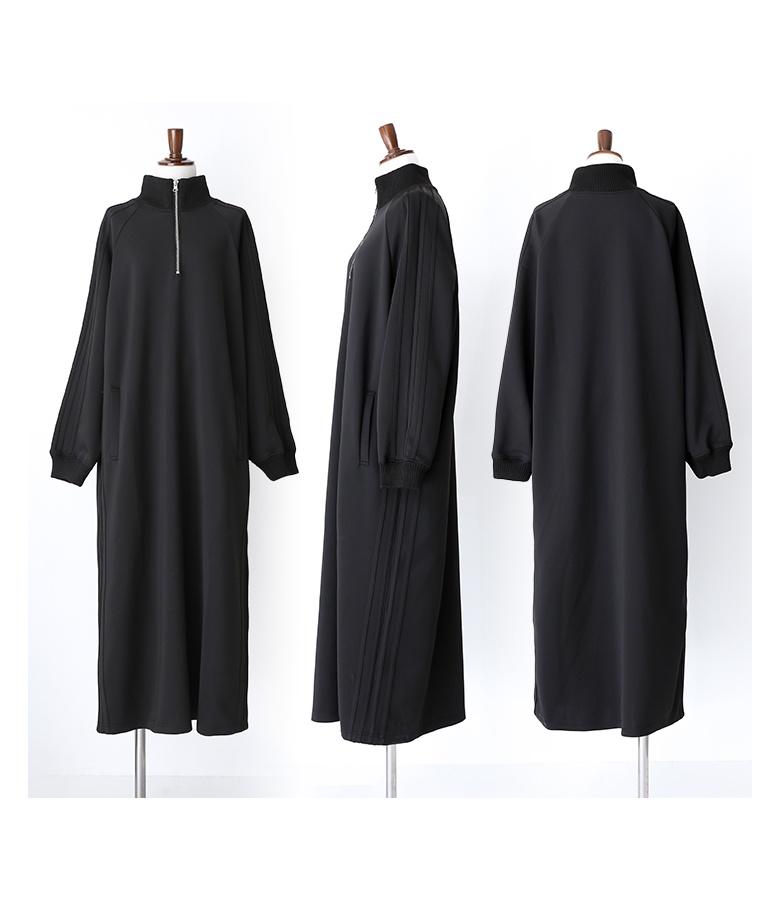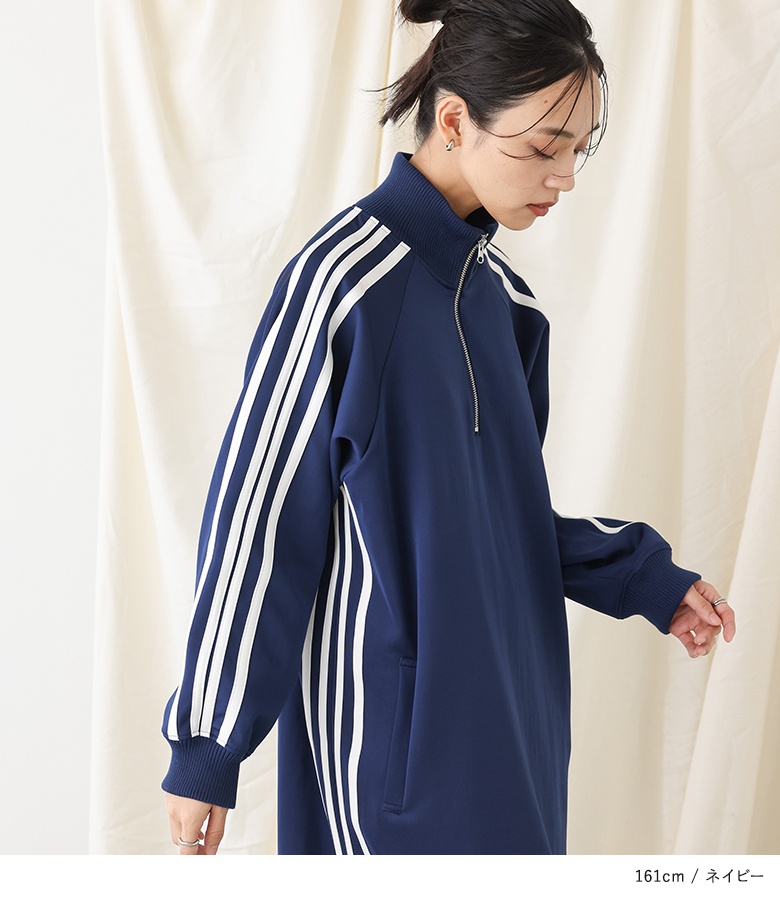 旬なトラックデザインで着映えする、すっきりシルエットのワンピース。スタンドネックのハーフジップで、その日のコーディネートや気分によってアレンジを楽しんで。