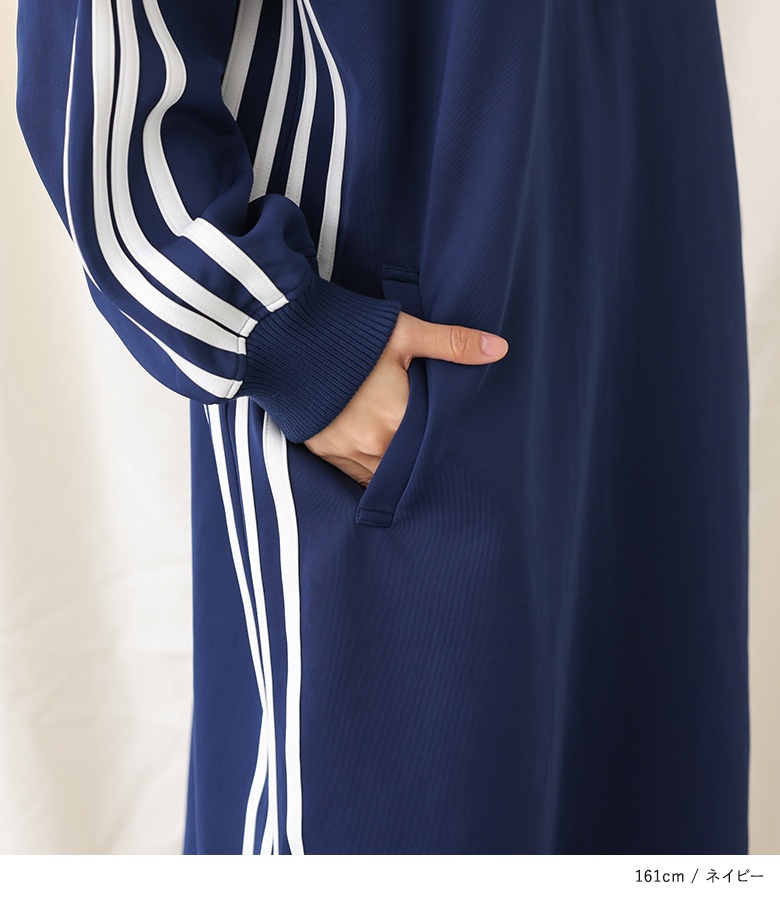 ロングワンピース 長袖 レディース ワンピース トラックジャケット ロング丈 ハーフジップ 配色ライン ジャージワンピ スタンドネック「メール便不可」「30」
