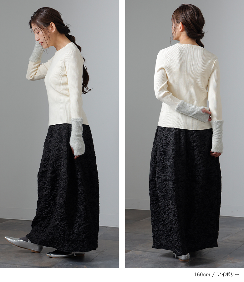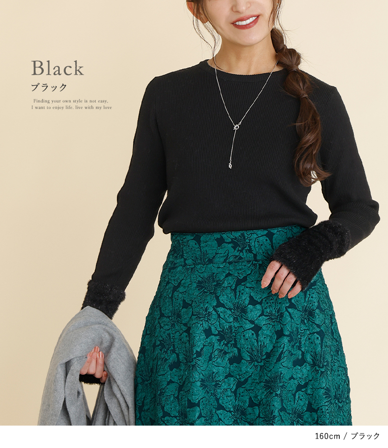 リブ素材でしめつけ感なく、すっきりしたシルエットで着用できました。袖口は上からアウターを羽織った時もポイントになって、とにかくかわいいです。