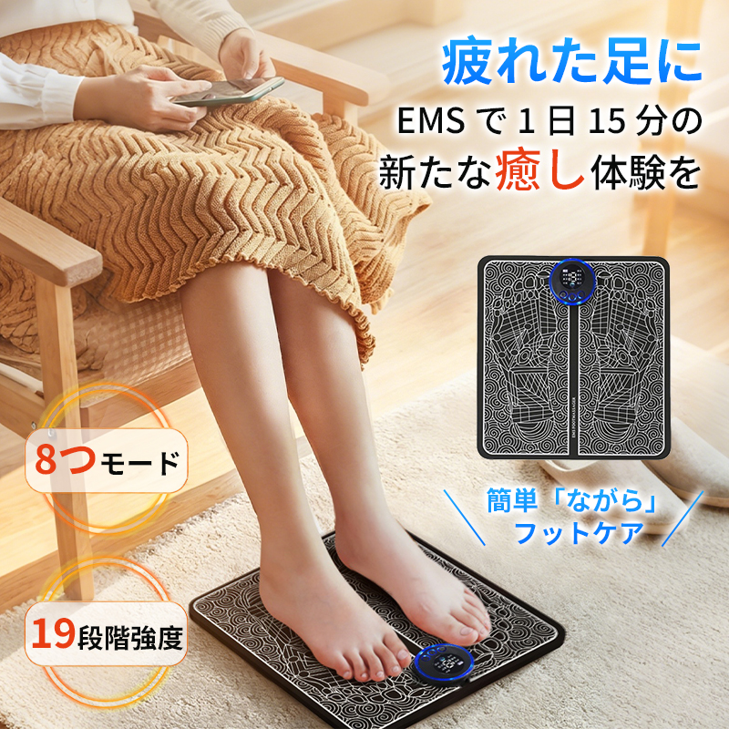 EMSフットマッサージパッド フットマッサージ 筋肉痛 マシン美脚マット 脚痩せ 8つモード 19段階強度 USB充電式 筋トレ 電気 刺激 コンパクト 母の日
