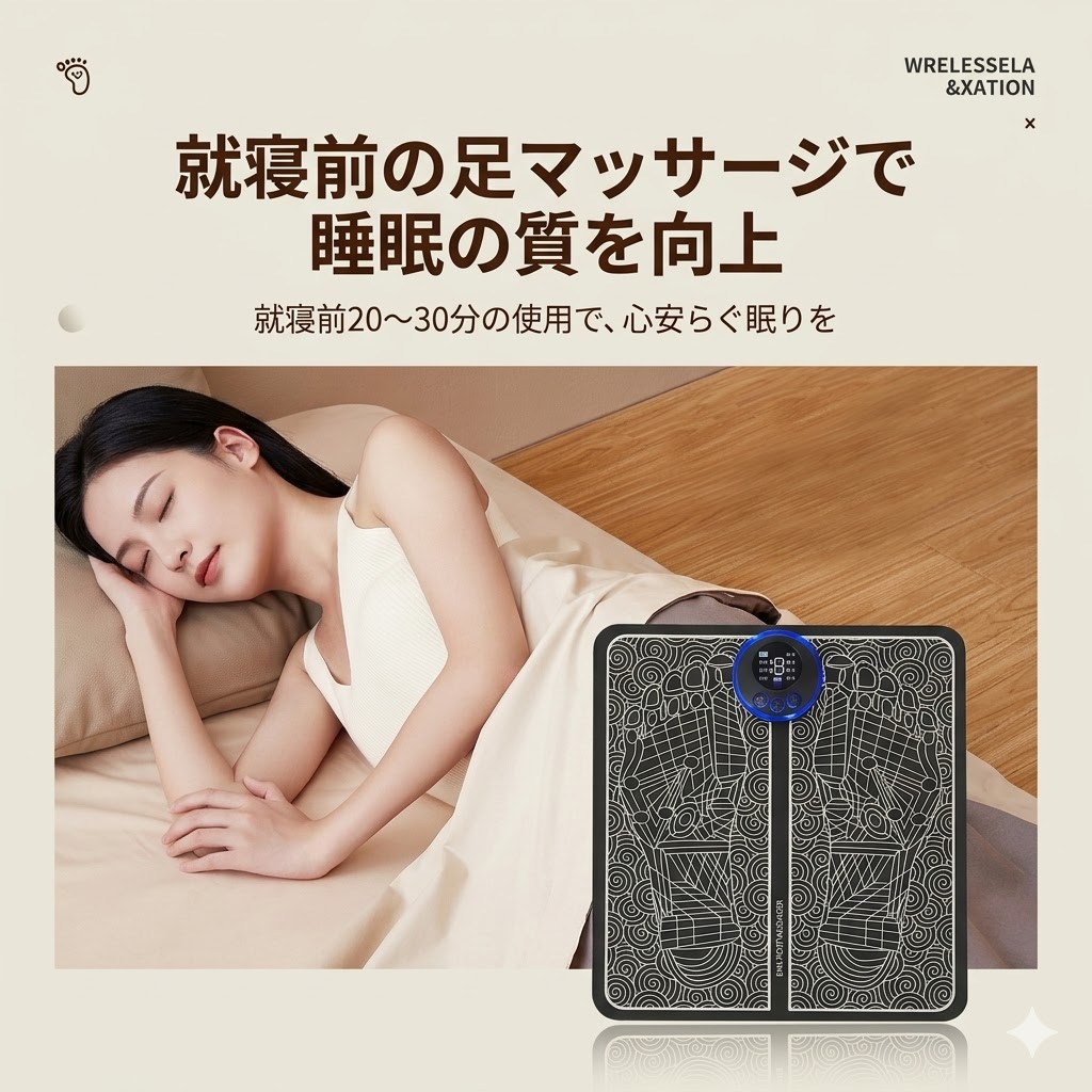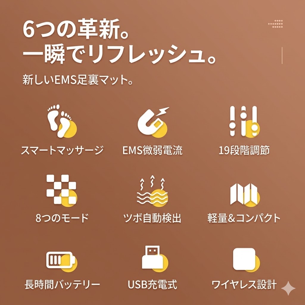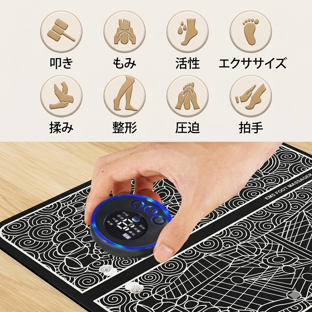 EMS 低周波刺激:足裏のツボに EMS 微電流を届け、筋肉をほぐして血行を促進。疲れやむくみを緩和します。